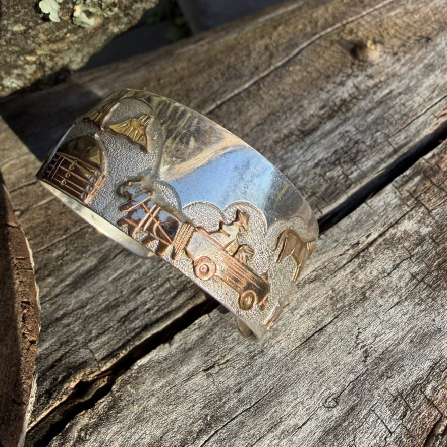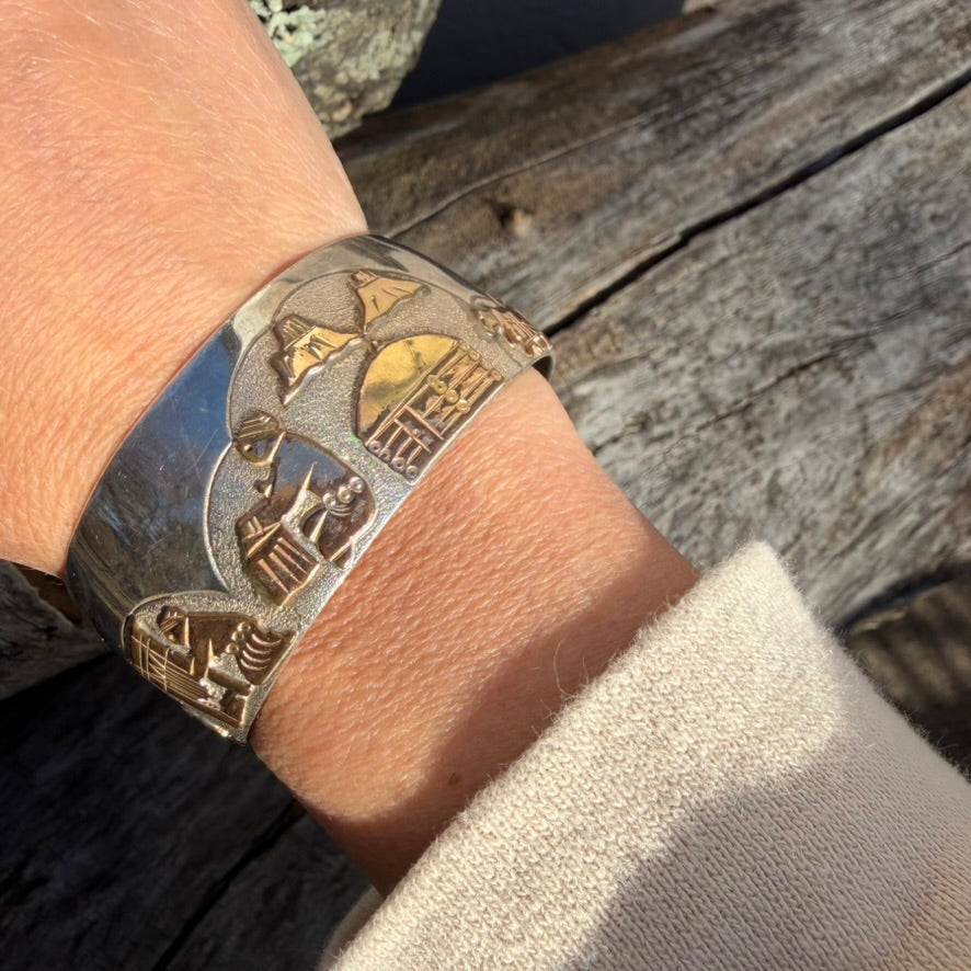 Apache Richard Reeve Sterling Silver with Gold Overlay Storyteller Cuff Bracelet