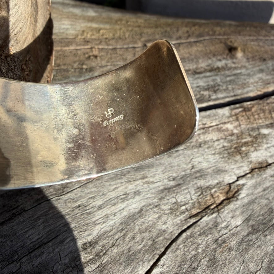 This wide vintage sterling silver storyteller cuff is by Apache Richard Reeve. The intricate cuff depicts aspects of daily life, both at work and at home. The artist features a combination of animals including goats and horses, as well as people hard at work with mountains in the background. This is a wonderful representation of the gold overlay style on sterling silver. This cuff does show signs of preowned love, please see photos for age and patina spots. The 1 inch wide bracelet weighs 45 grams and the inside measures 6 inches end to end plus a 1 inch gap for a total inner circumference of 7 inches (the opening is slightly adjustable). Stamped RR for Richard Reeve.