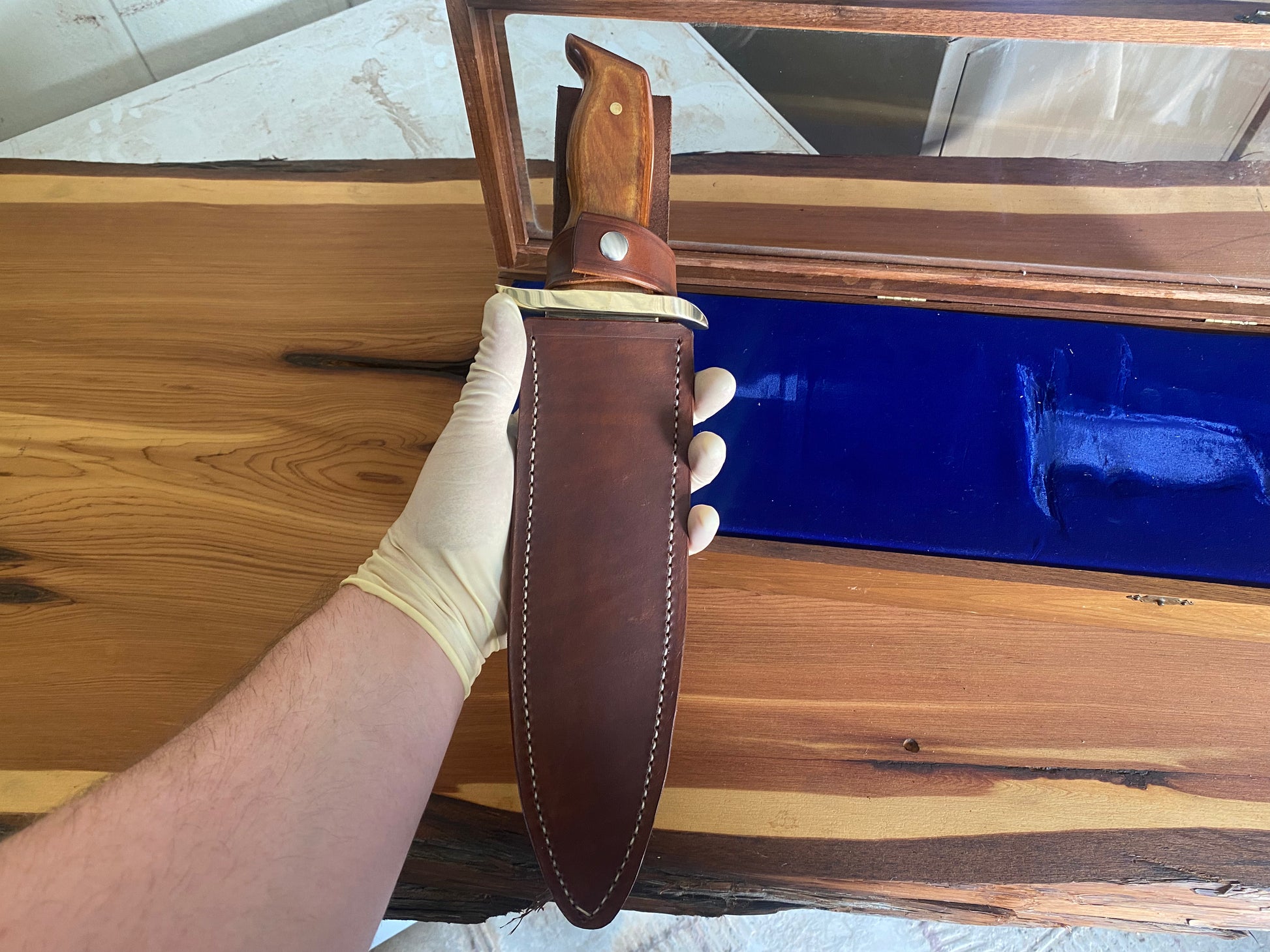 So what we have here is a beautiful Buck custom Harper-Davidson 85th Anniversary Bowie Knife Number 1751/3000. This knife is in fantastic unused condition but I have it marked as used because I do not have any paperwork for this knife and the hinges on the box are missing. The box is the original one to this knife and is in pretty good condition. The sheath that comes with this blade is a custom one I made and it is also in fantastic condition. Please be sure to look at all the photos carefully as they are part of the description.