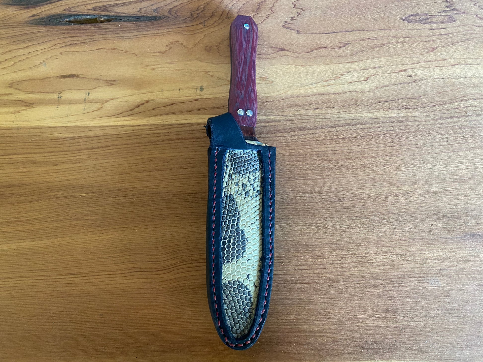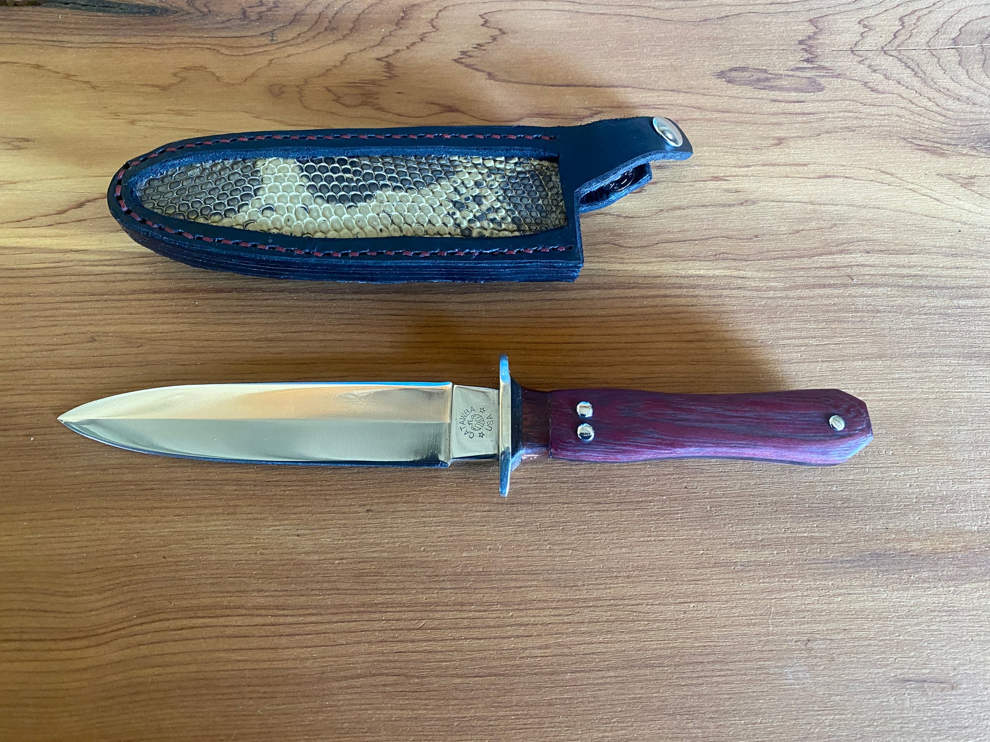 So what we have here is a beautiful Catawba Dagger. When I got this knife, it wasn’t in the best condition - the original handles were cracked and the sheath was not the original one to this blade. I replaced the handle with purple heart wood and made a new custom leather sheath, bringing it back to its former glory. I do not have the box or paperwork. Please make sure to look at all the photos as they are part of the description.