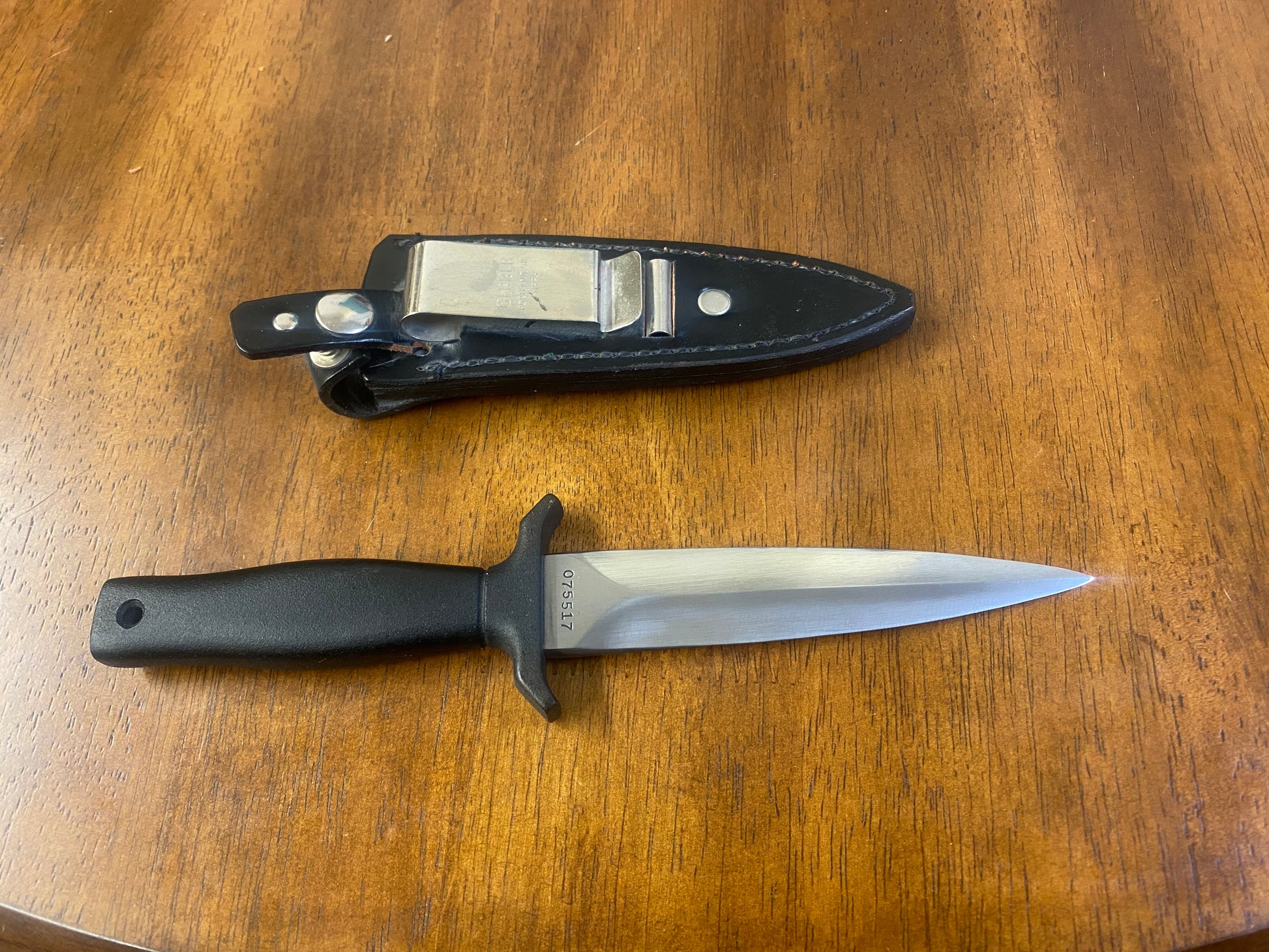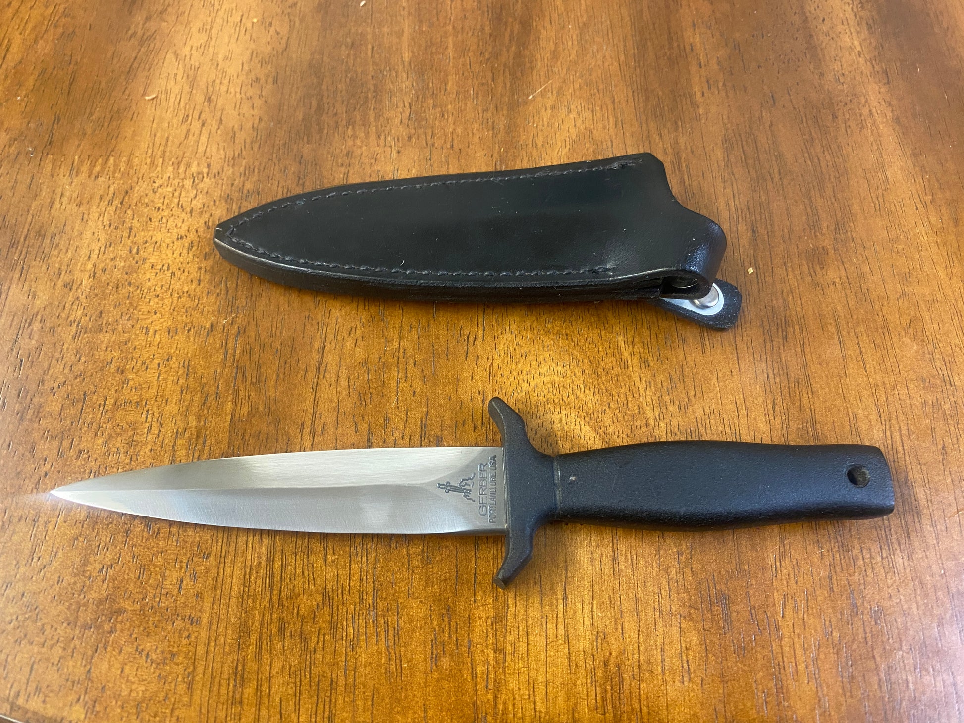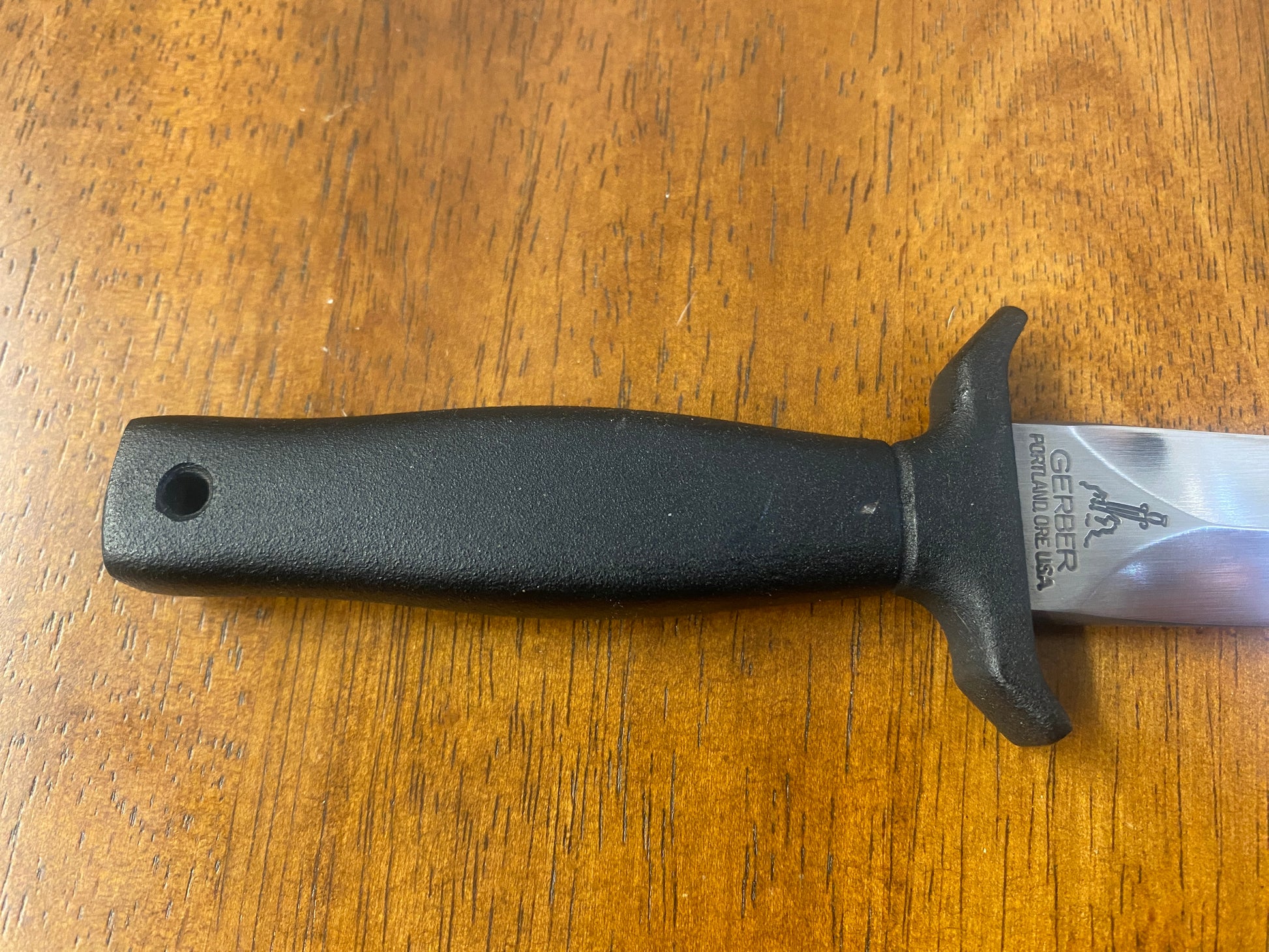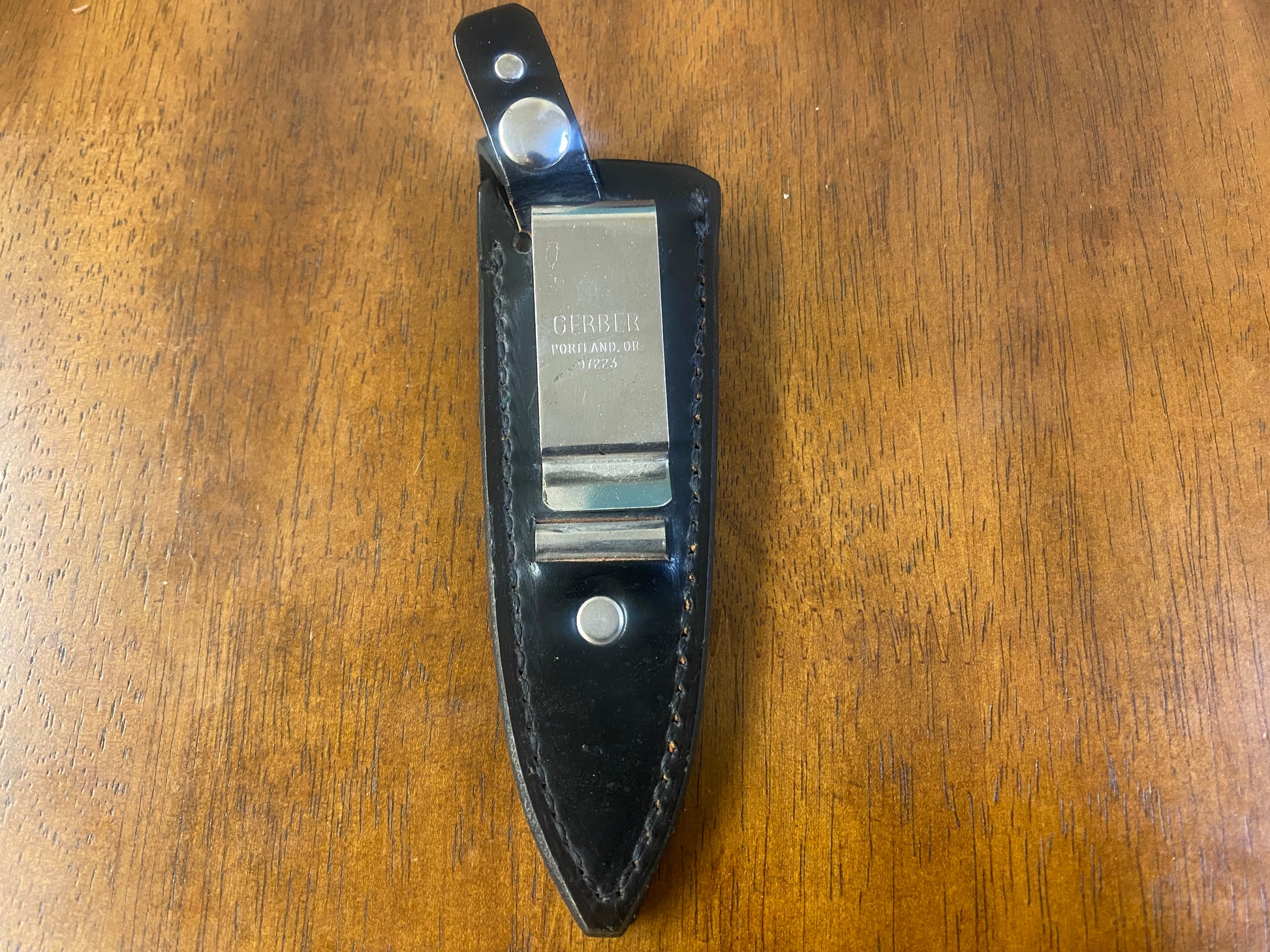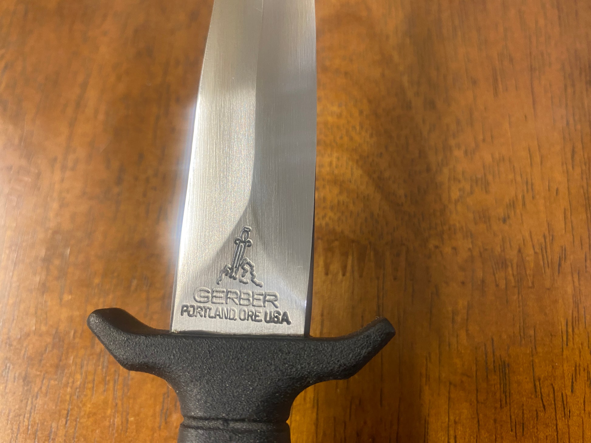 So what we have here is a beautiful Gerber Mark 1 Dagger Sheath Knife. This knife is in fantastic condition and appears not to have been used, carried, or sharpened. However there is some wear on the handle from traveling to and from shows and from one of its previous owners storing it the wrong way. The sheath is original and is also in fantastic condition. I don’t have the box or paperwork for this knife and don’t know if even came with any in the first place. Please look at all the photos carefully as they are part of the description.