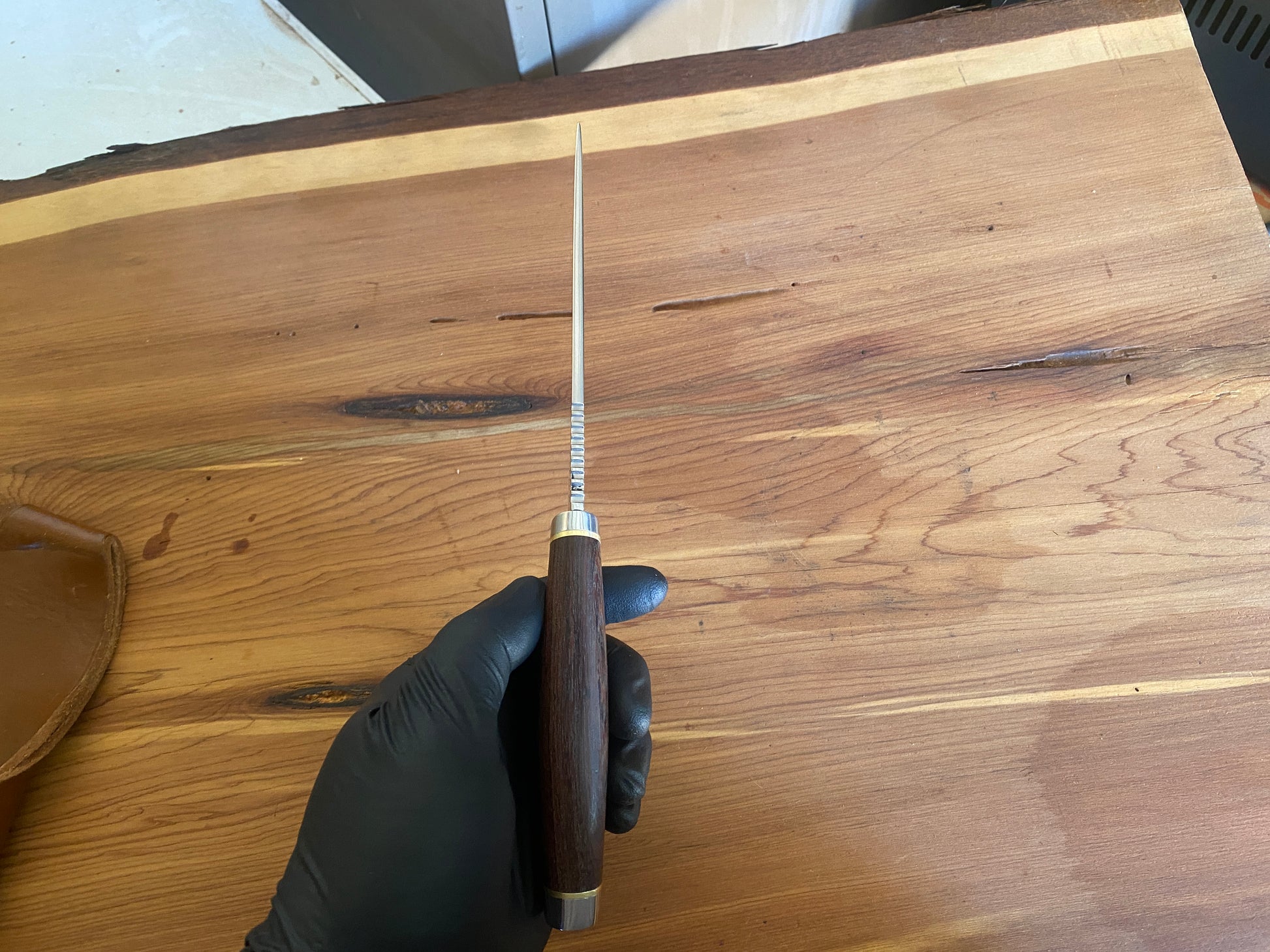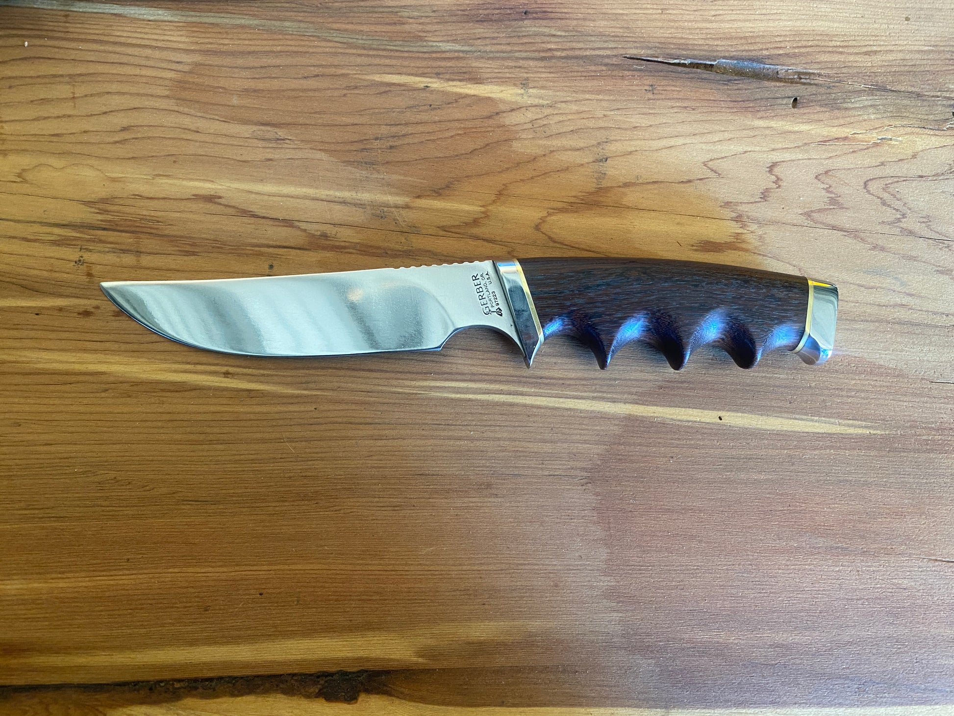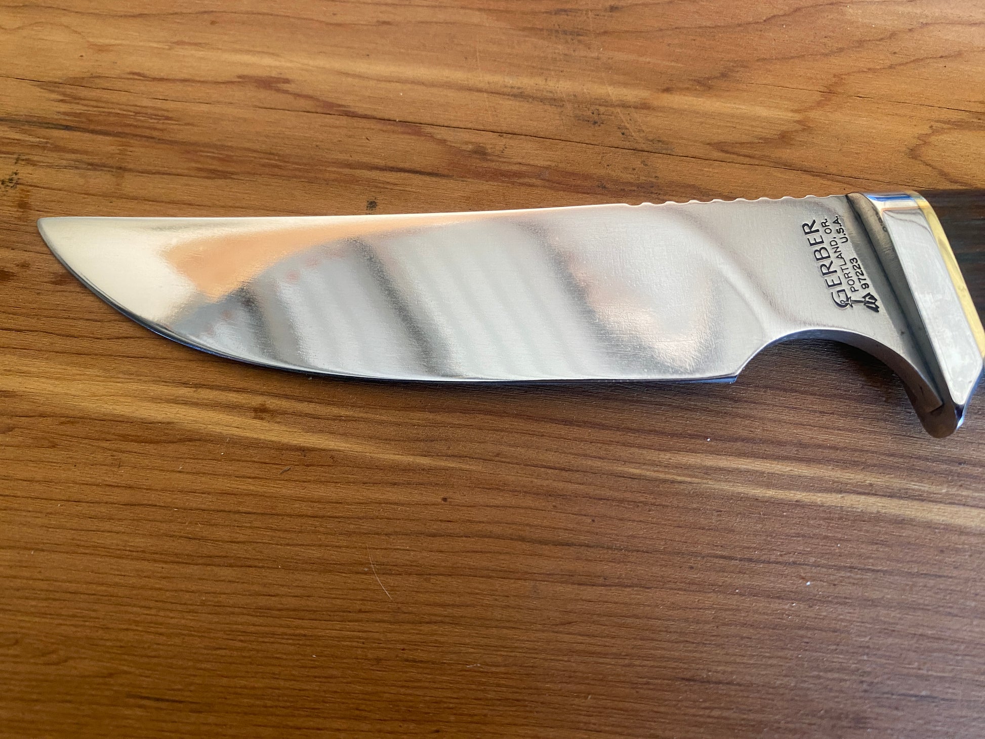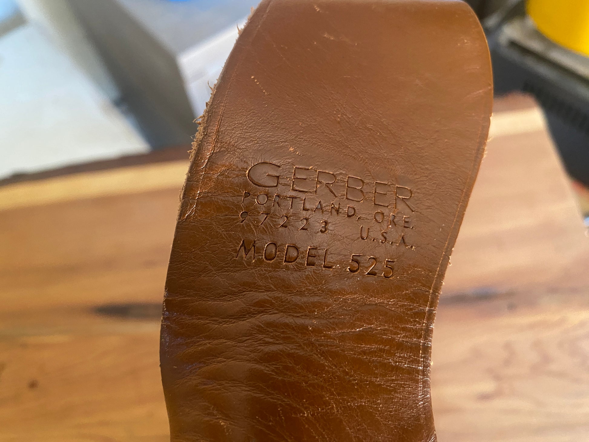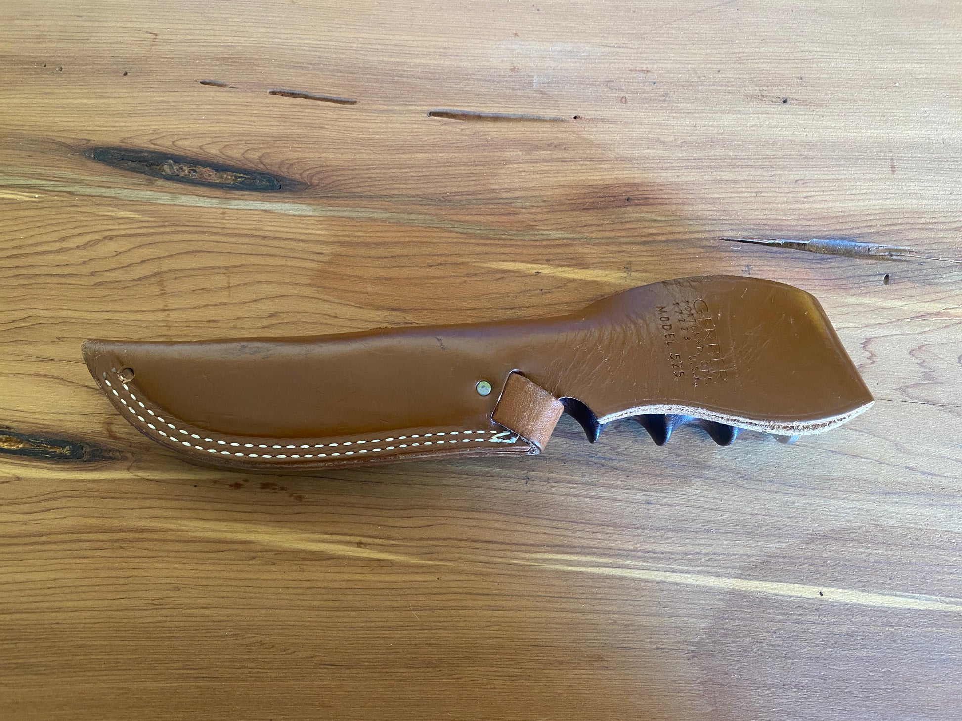 So what we have is a beautiful Gerber Model 525 S.59 Sheath knife. When I got this knife it wasn’t in great condition; it had a good amount of sheath wear and marks on the blade from being used. I cleaned the entire blade up, put a nice edge back on it (by hand, not machine) and brought it back to its former glory. I then had the model laser engraved because the original stamping was practically gone. This knife comes with its original sheath which does have some wear on it and the original owner tried to punch a hole into it. I do not have the box or paperwork. Please be sure to look at all the photos carefully as they are part of the description.