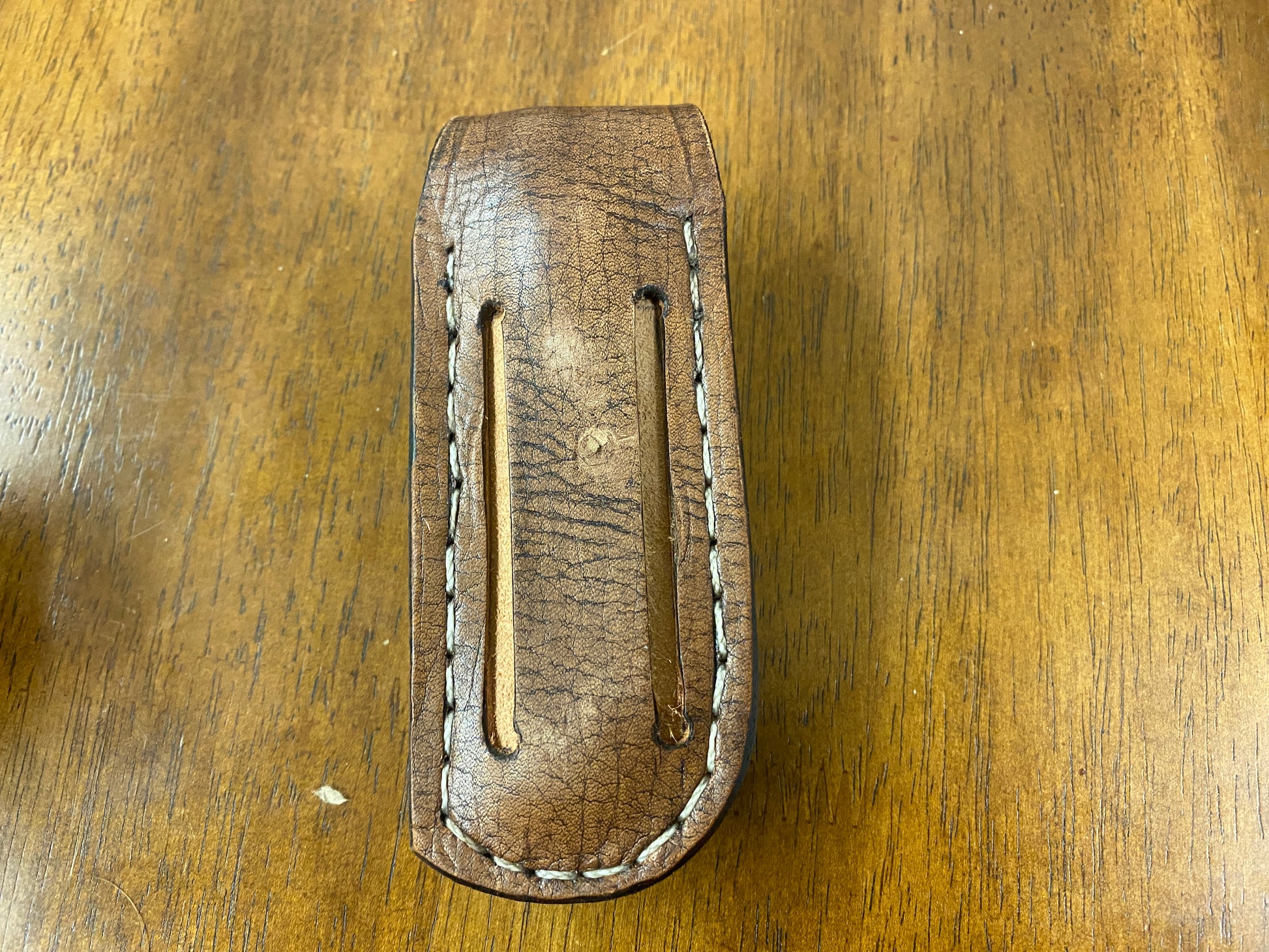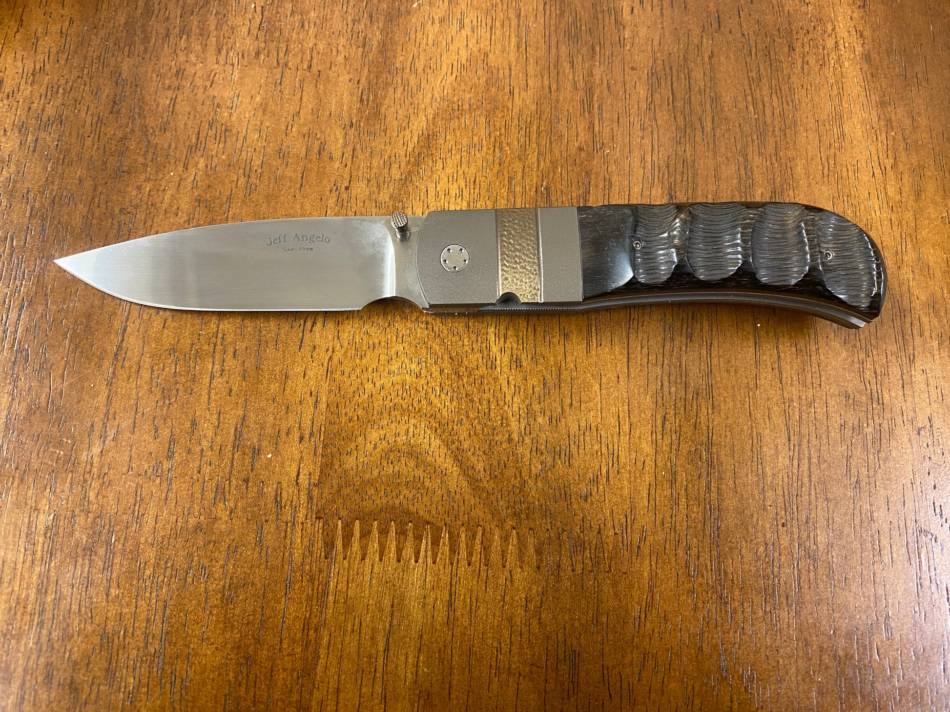 So what we have here is a beautiful Jeff Angelo pocket Knife.This knife is in fantastic condition and appears not to have been used, carried, or sharpened. There are however some natural chips on the scales do to the material used (see photos). I don't know if the sheath is original but it is also in fantastic condition and fits the knife perfectly. I don’t have the box or paperwork for this knife and don’t know if even came with any in the first place. Please look at all the photos carefully as they are part of the description.