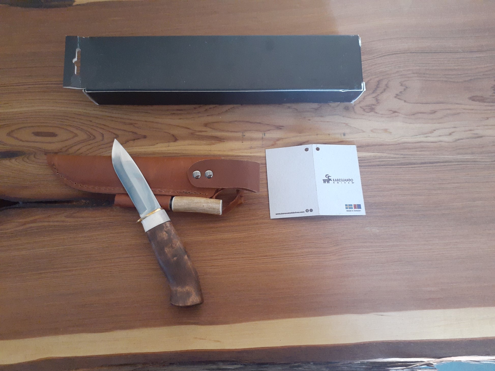 So what we have here is a beautiful Karesuando Survival sheath Knife. This knife is brand new, and has its original box, sheath, and fire starter. The box is in poor condition which is the way I acquired it. Please be sure to look at all the photos carefully as they are part of the description
