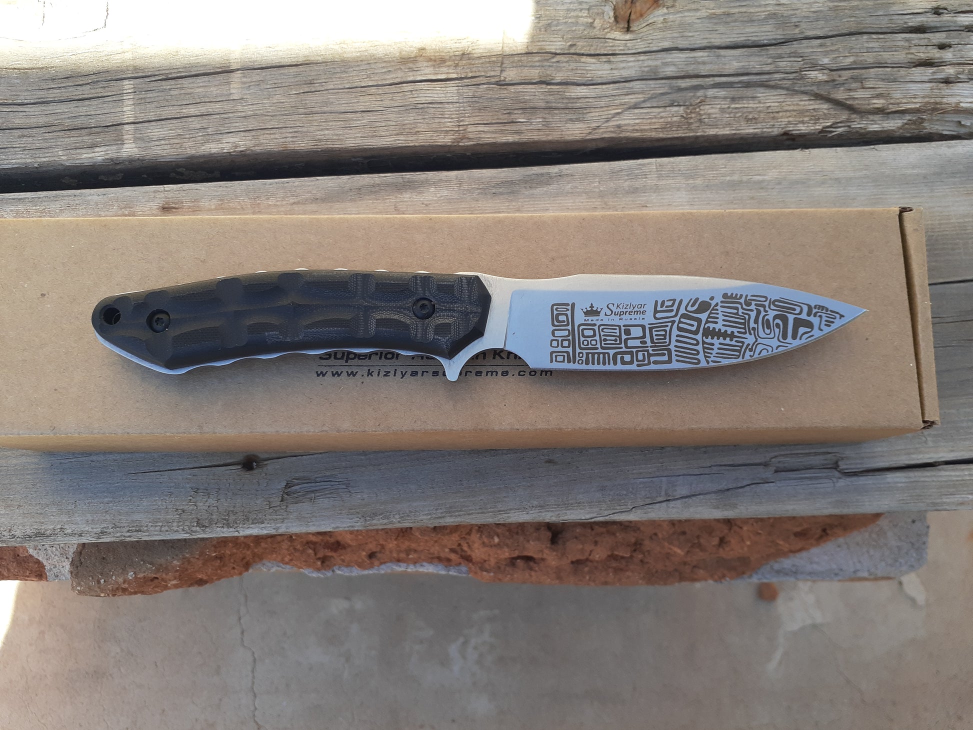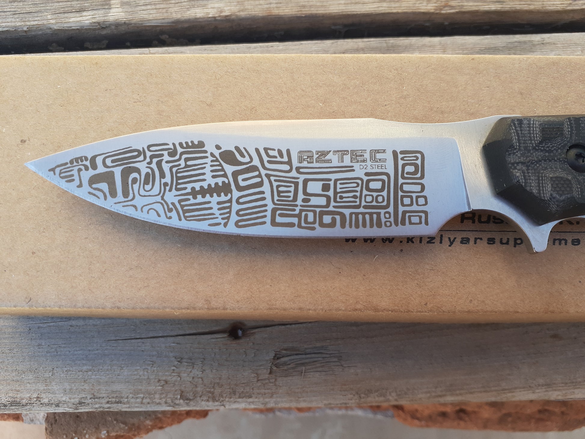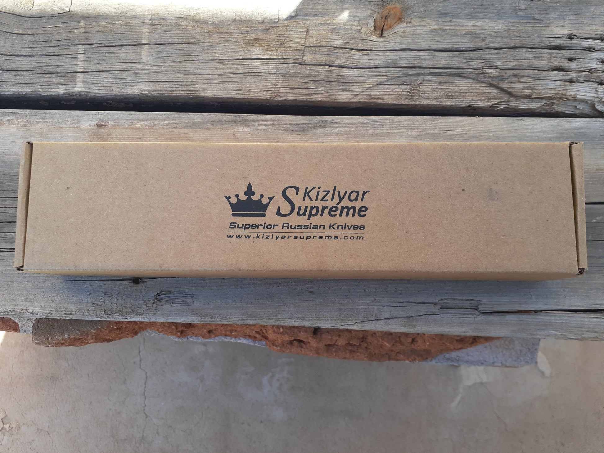 So what we have here is a beautiful Kizlyar Supreme Aztec Sheath Knife, brand new in the box. This blade comes with its original box, sheath, and paper work. Features are as follows: Steel ~ D2 tool steel Handles ~ black Sculpted G-10 Blade length ~ 4.5" Overall length ~ 8.88" Sheath ~ Brown leather Made in the ~ Russia Please look at all the photos and ask any questions before buying as this is a final sale. By purchasing this knife, you are attesting to legal age and state law to own it. Please expect regular wear to be evident on boxes from packing/transport to and from shows while the item continues to be listed online. If any severe damage occurs to boxes, the item description will be updated accordingly. |