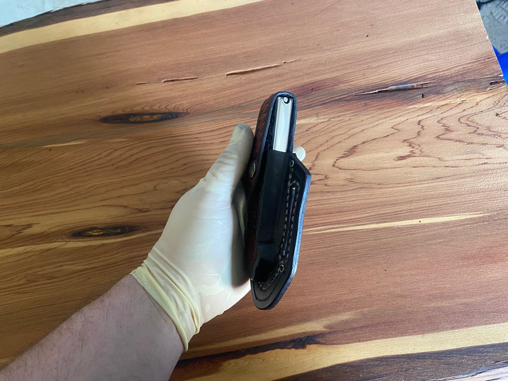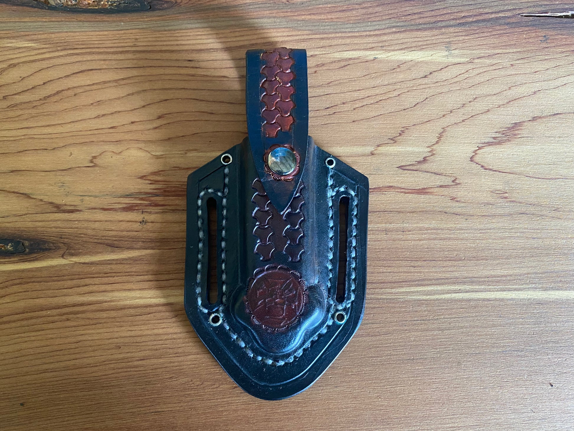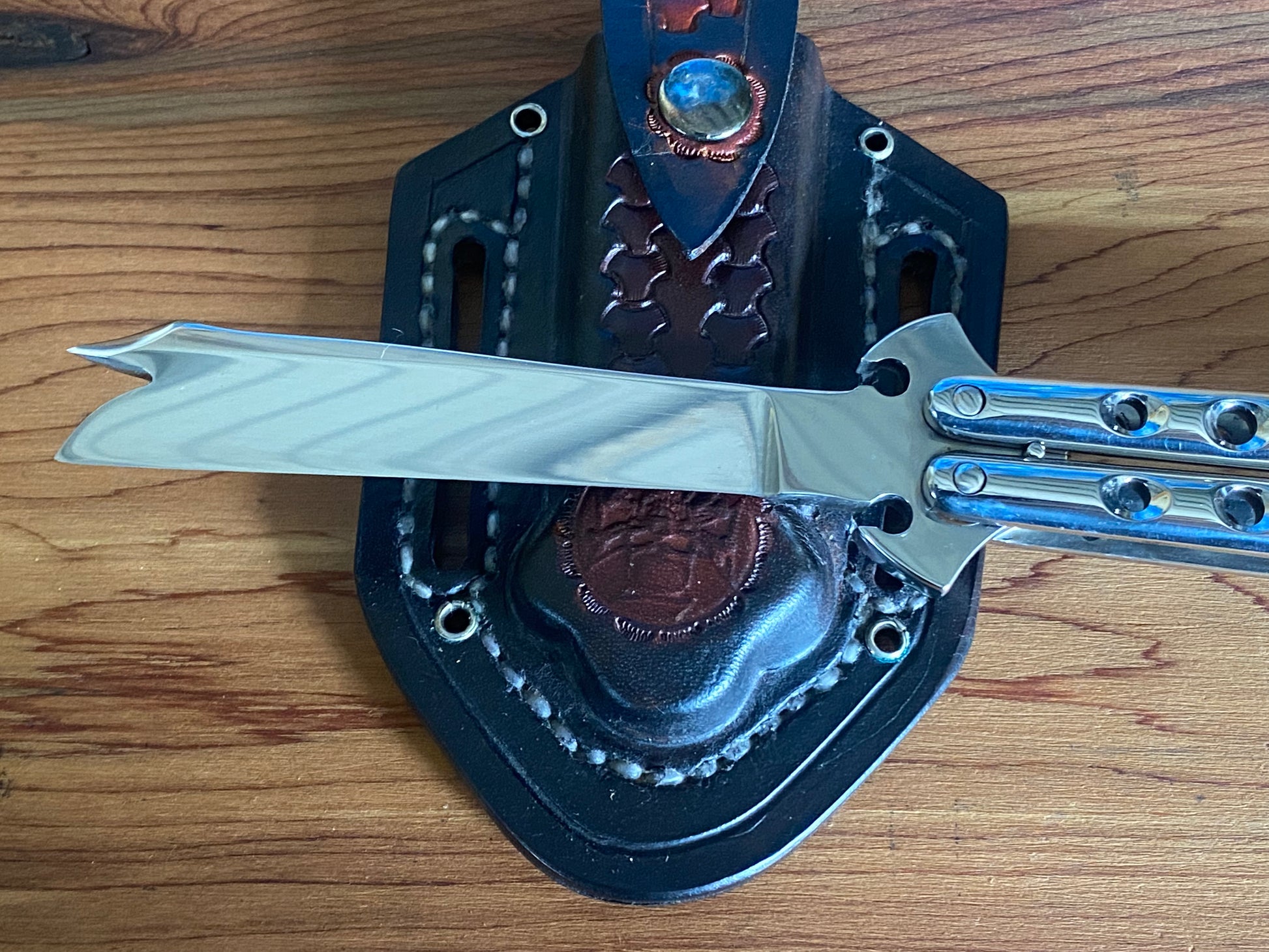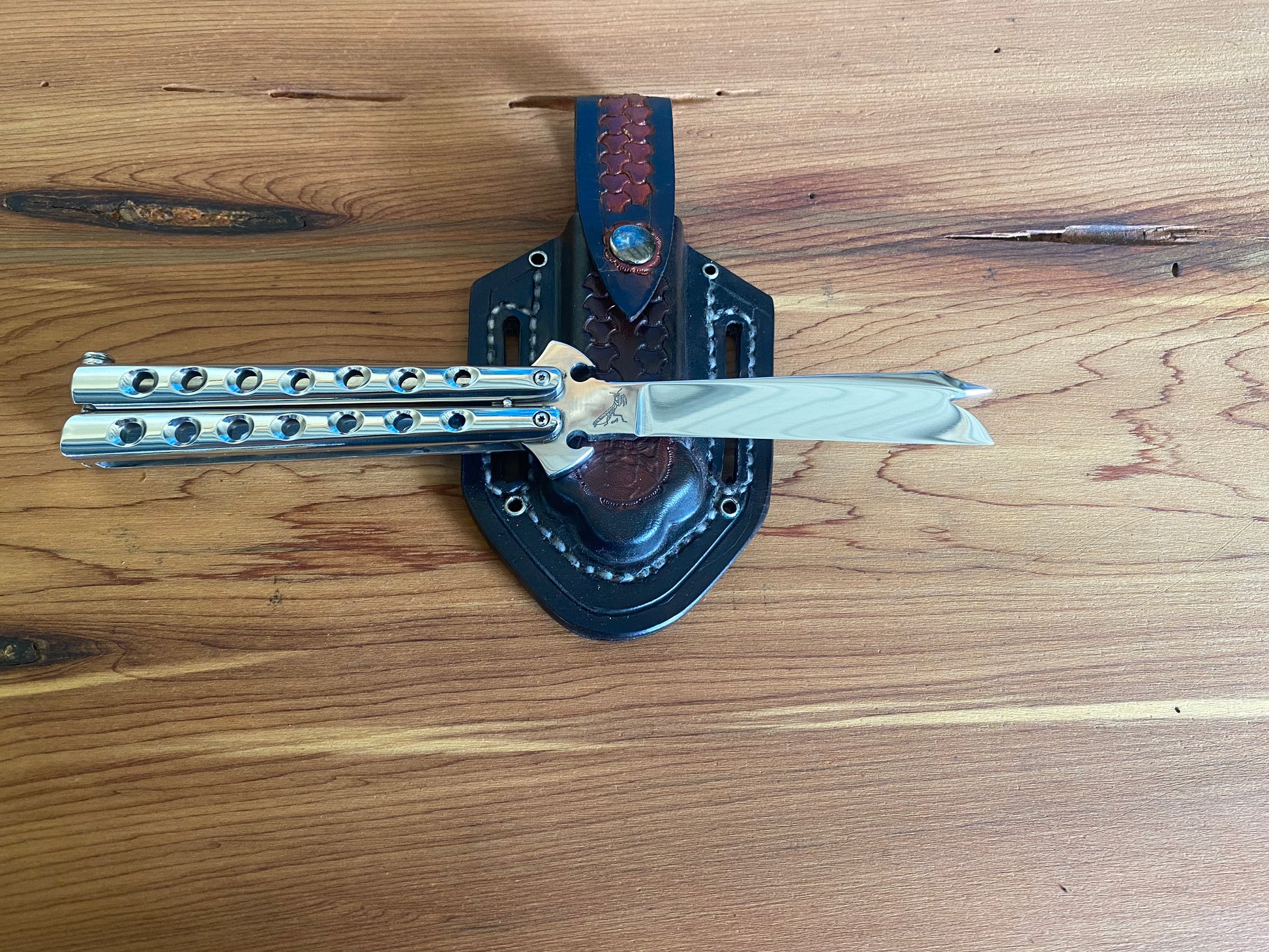 So what we have here is a beautiful Matt Cook Pinoy Butterfly Knife. This knife is in fantastic unused condition. The sheath that comes with this blade is the original made by the same Matt Cook and it is also in fantastic condition. Please be sure to look at all the photos carefully as they are part of the description.