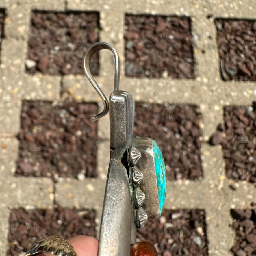 This large naja pendant by Robert Chee features a stunning cushion cut turquoise with webbed matrix at the top and two lighter green turquoise rounds at each end. This hefty naja weighs a sturdy 85g and features a shepherd's hook bale for ease of swapping between all of your chains and beads. Perfect for layering with other favorites!