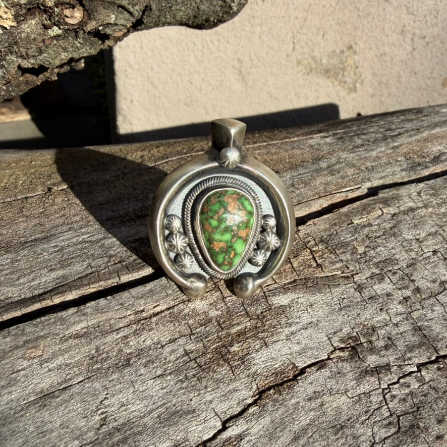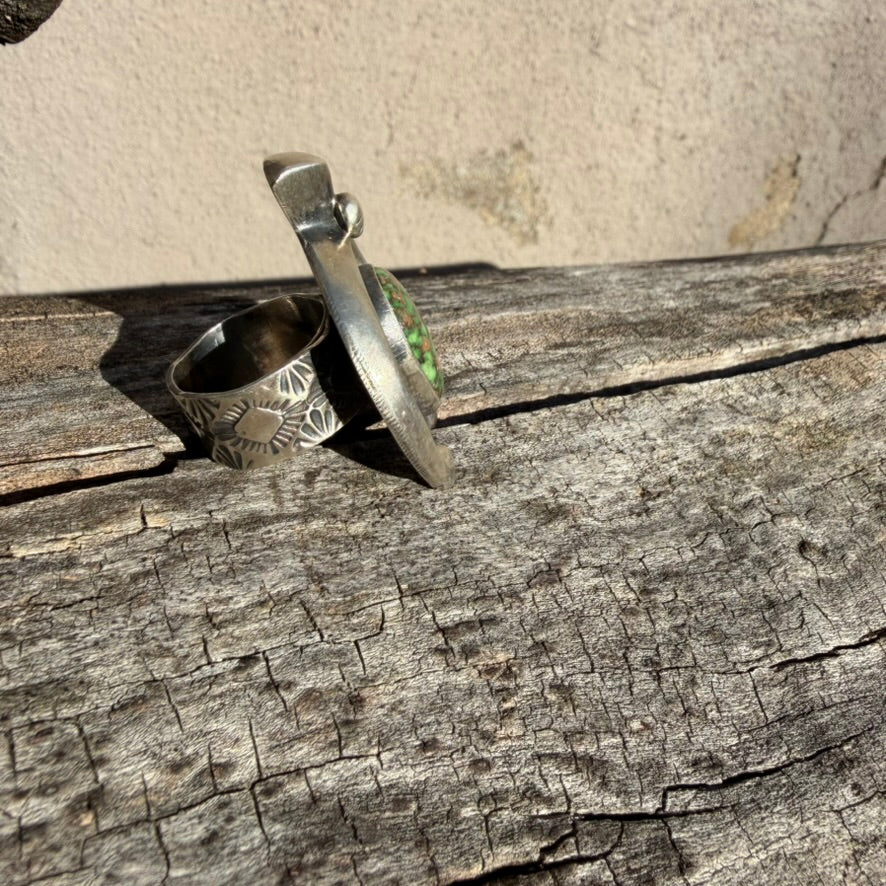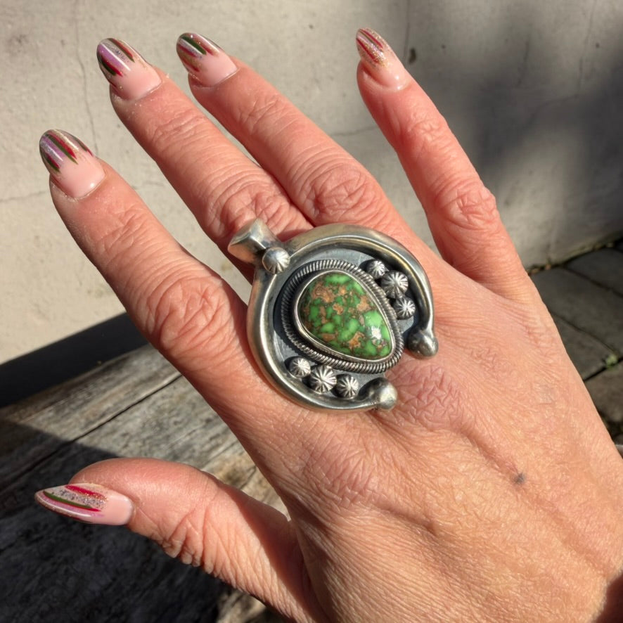 This ring features an incredibly complex, deeply matrixed green Royston Turquoise set inside of a classic style Naja. The total face size measures 1 3/4 in x 1 1/2 in. The 3/8 inch wide stamped adjustable silver band makes this easily wearable on any finger!
