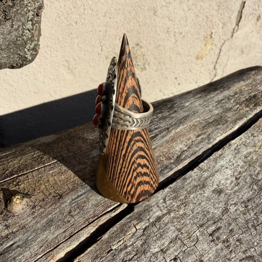This stunning concho style ring ring features a 1 3/4 in x 1 1/4 in ring face with 4 deep red Mediterranean Coral cabochons. The stamped silver band measures 1/4 inch wide and makes this ring comfortable and easy to wear.