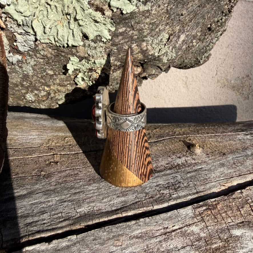 This stunning adjustable band ring features a 1 1/4 in x 1 in cluster of 11 deep red Mediterranean Coral cabochons. The 3/8 inch wide stamped adjustable silver band makes this easily wearable on any finger! This ring style by Leon Martinez was a featured collectible product created for the Naomi Glasses x Ralph Lauren Collaboration in 2024.