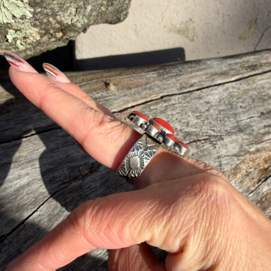 Navajo Sterling Silver Mediterranean Coral Cluster Ring Signed by Leon Martinez