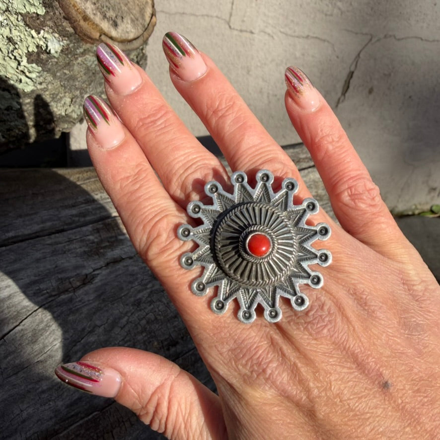 This stunning adjustable band ring features a 1.75in diameter silver sunburst face with a deep red Mediterranean coral center. The 3/8 inch wide adjustable silver band makes this easily wearable on any finger!