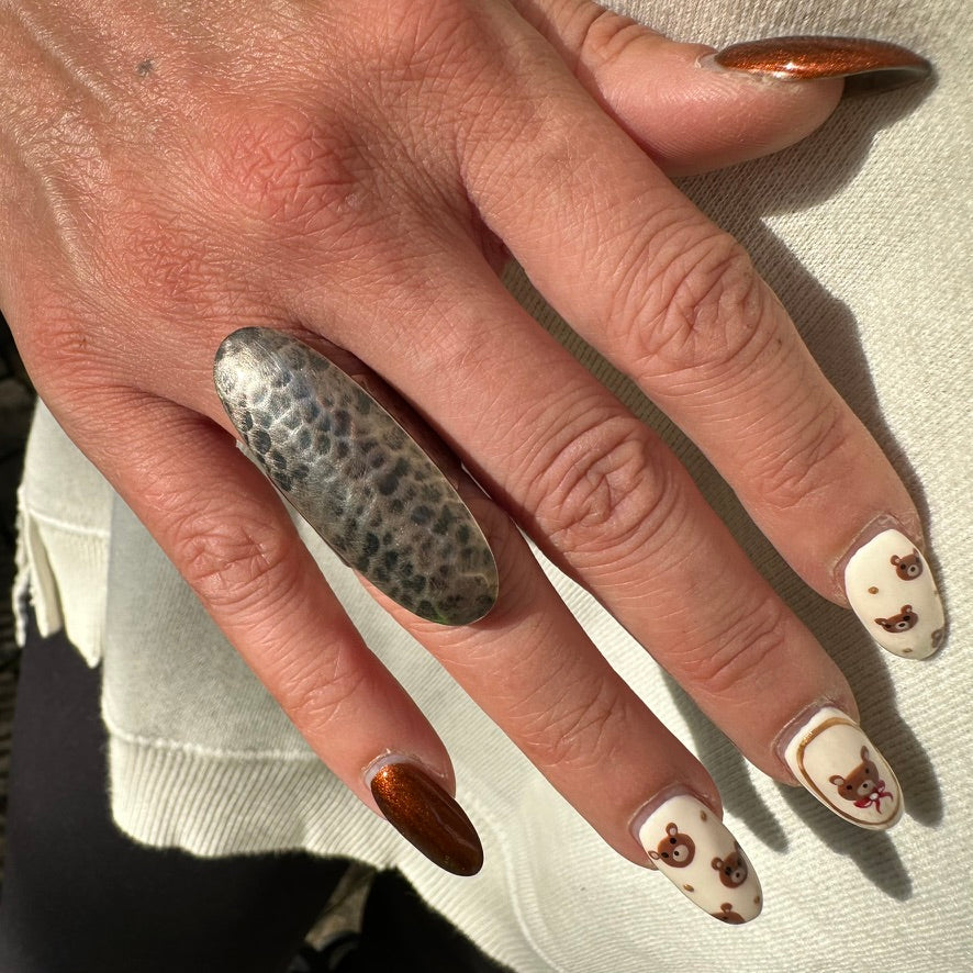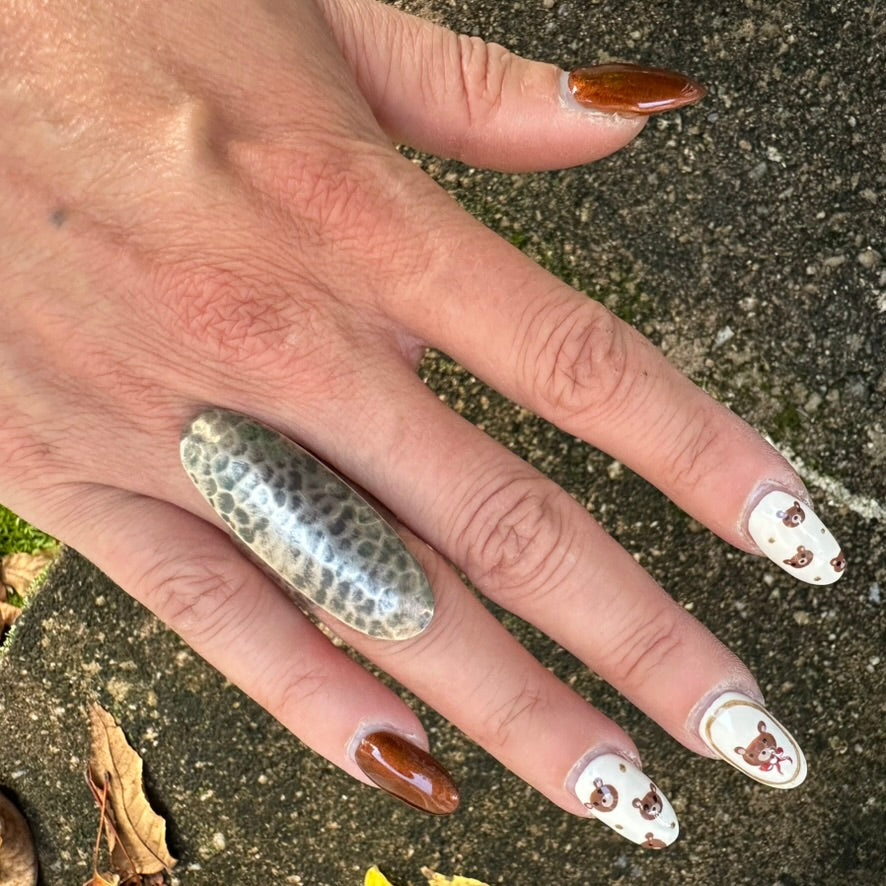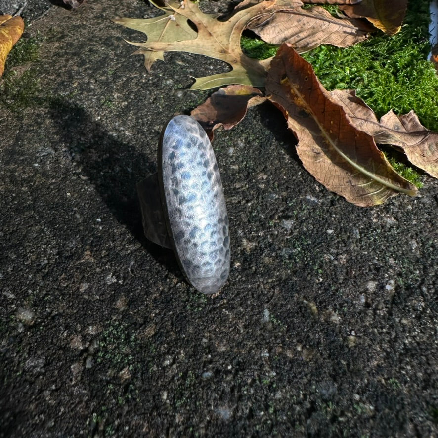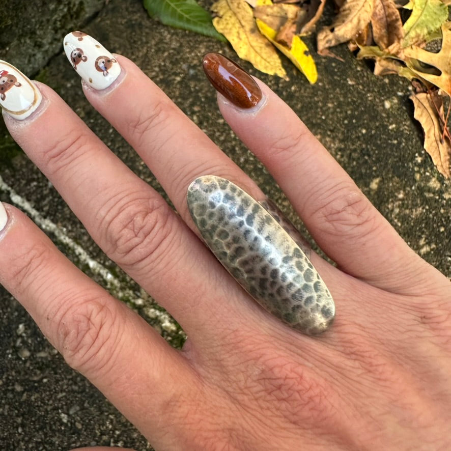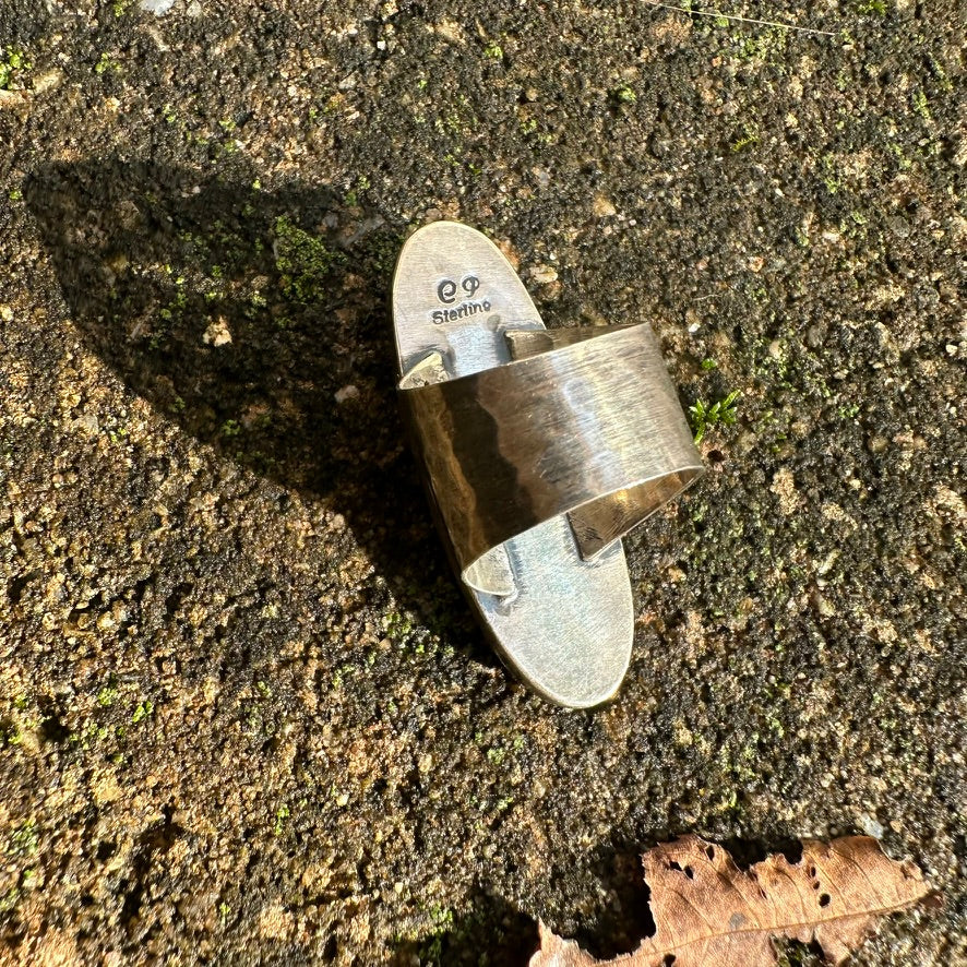A modern twist on a classic design- a hammered silver shield ring by Clendon Pete. The texture and finish on this wide band ring makes it incredibly comfortable to wear. The face of this ring measures 1-3/4 x 1/2 in.