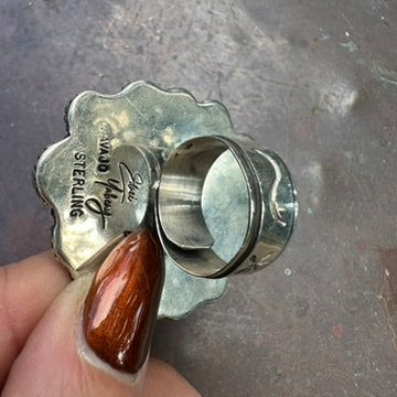 Gorgeous Navajo Turquoise and Sterling Silver Adjustable Cluster Ring with a unique Brass Cast Ammonite fossil in the center. Such amazing craftsmanship on this ring! Signed by the artist Ednei Yabeny and stamped Sterling. Ring face measures 2 inches long and 1-1/2 inches wide.