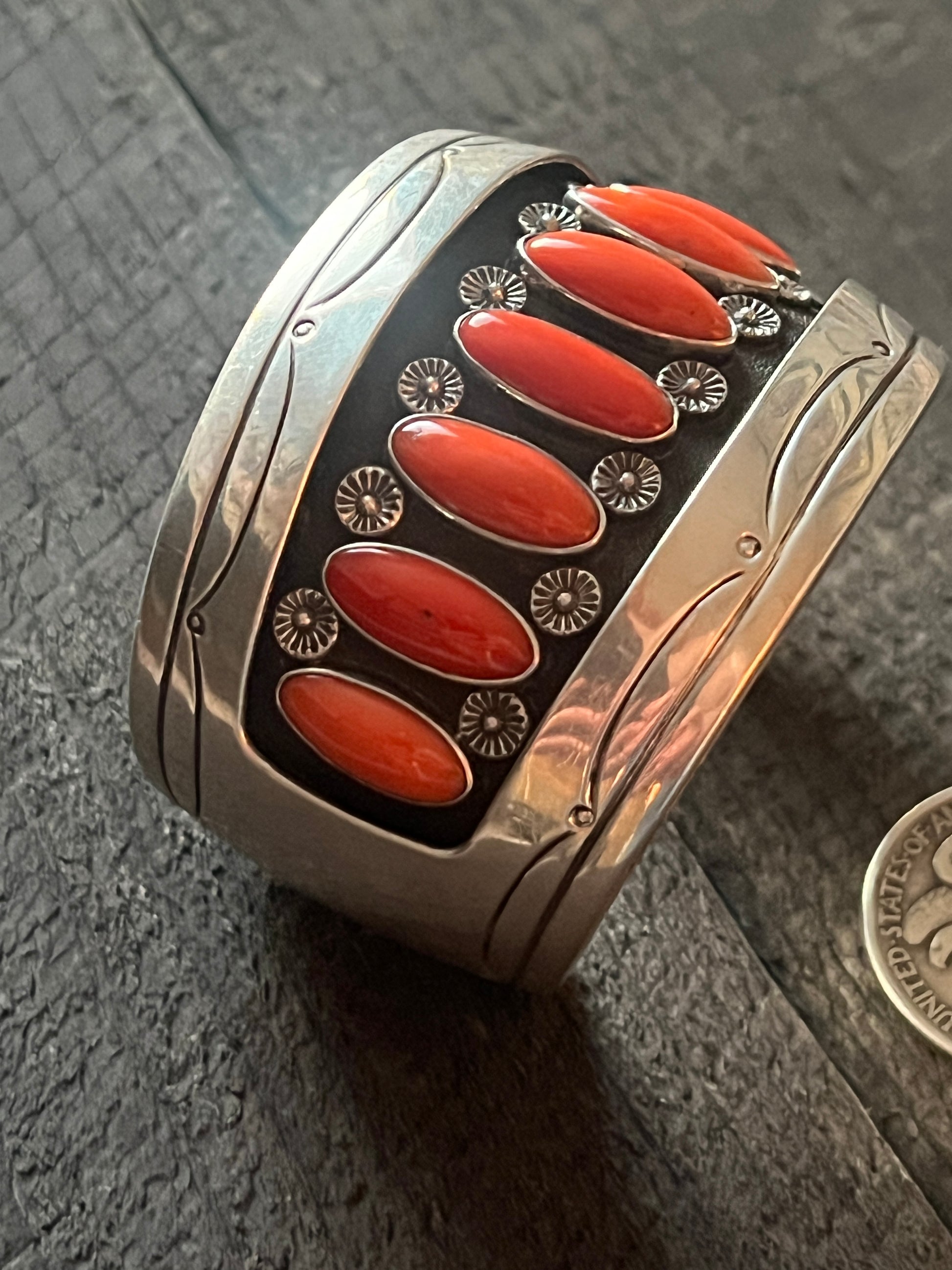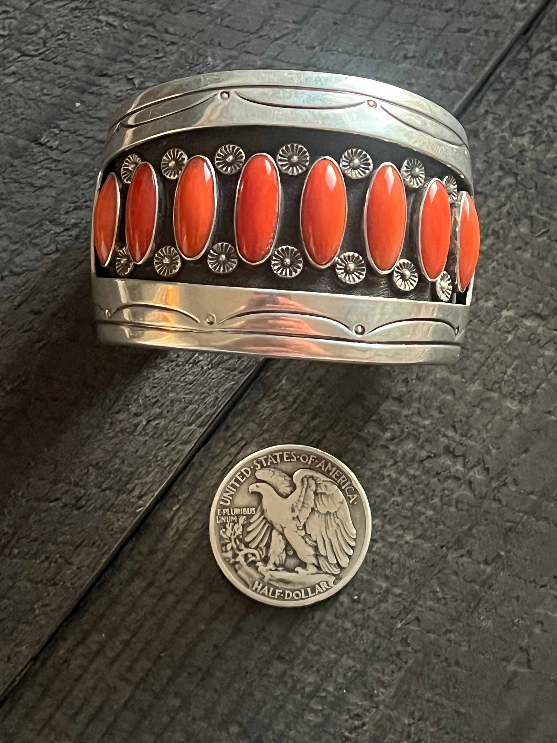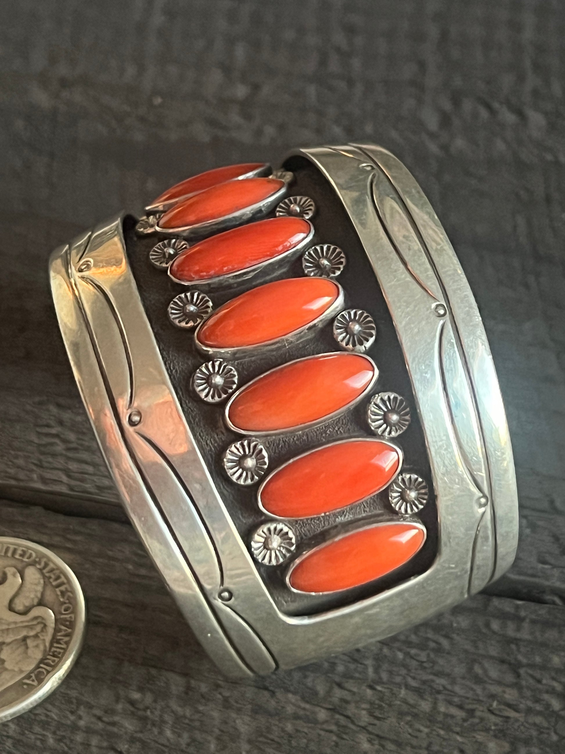 Old Pawn Sterling Silver & Mediterranean Coral Shadowbox Cuff Bracelet, Signed T.B