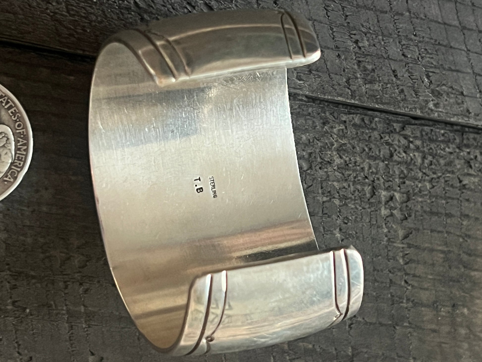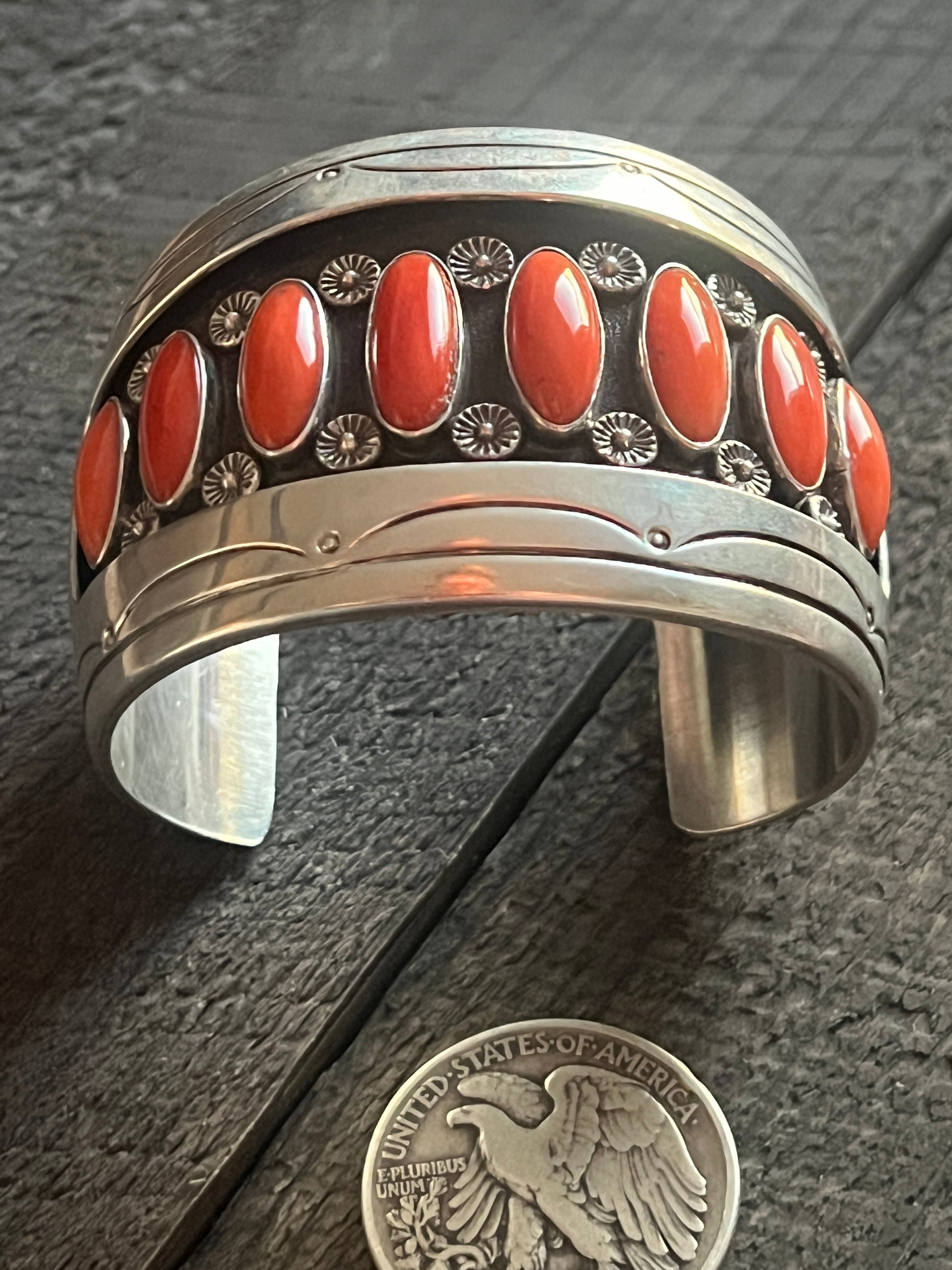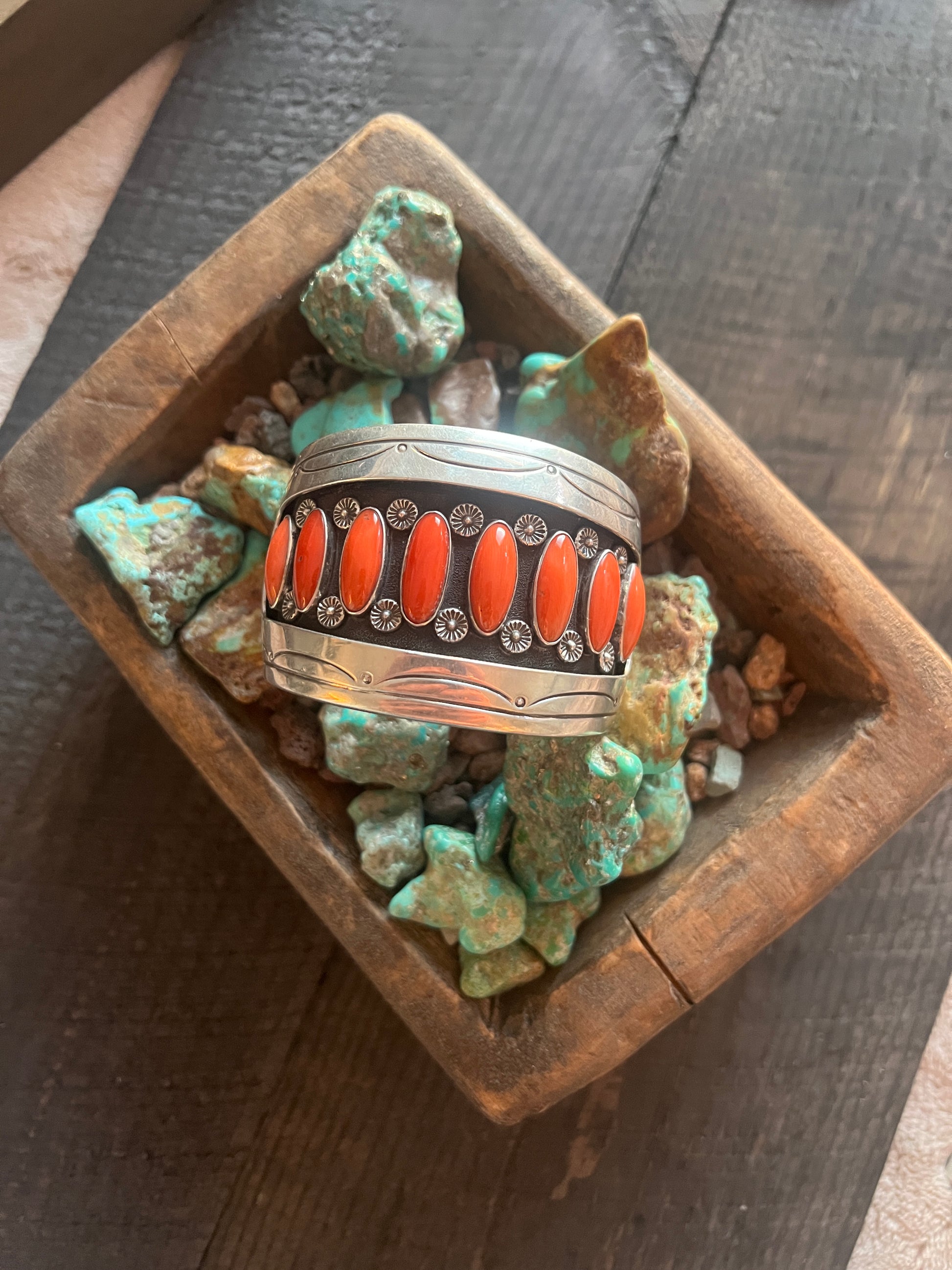Old Pawn Sterling Silver & Mediterranean Coral Shadowbox Cuff Bracelet, Signed T.B