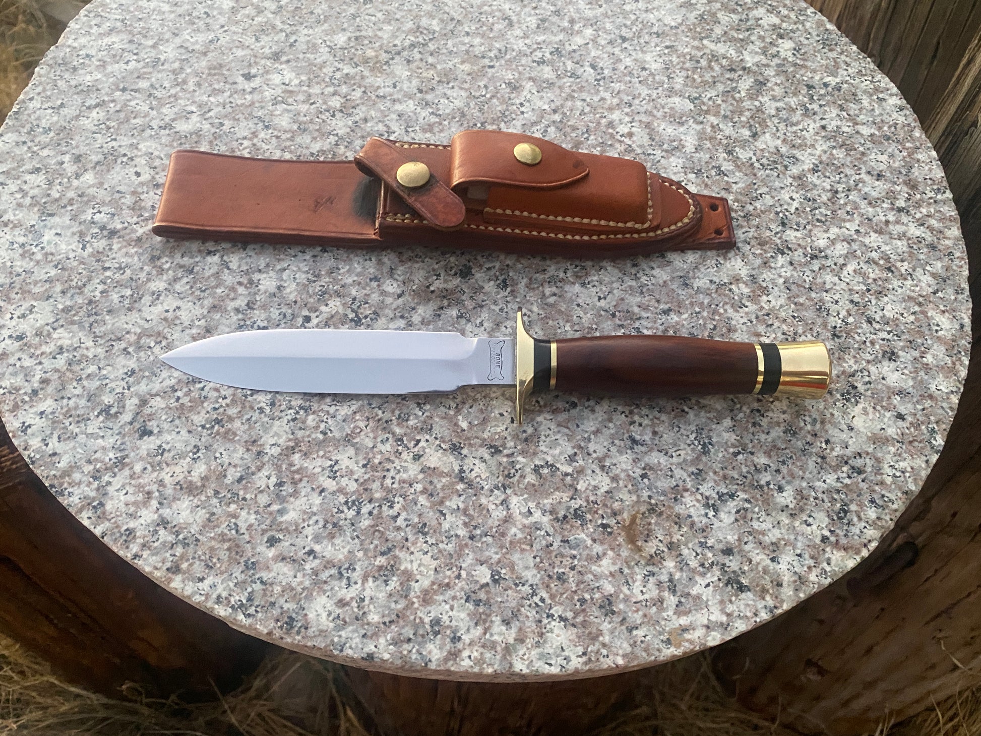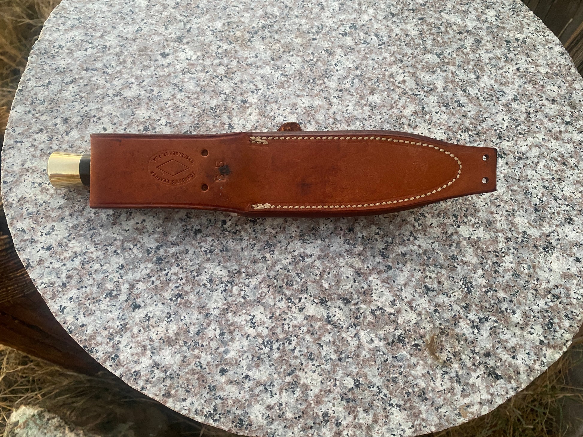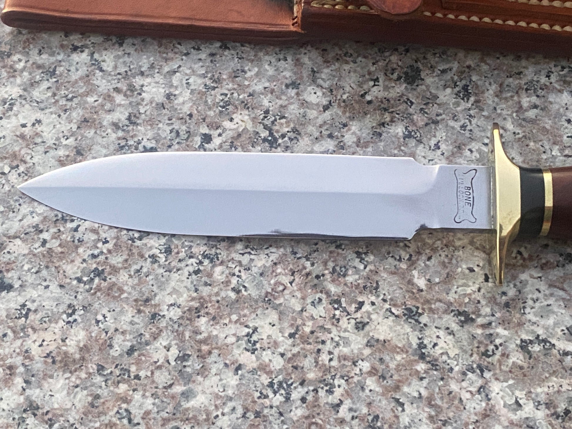 So what we have here is a beautiful Ralph Bone 319 Dagger Sheath Knife. This knife is in fantastic unused condition but I have it marked as used because I do not have the box or paper work witch I do not know if it even came with any paper work or a box. The sheath that comes with this knife is the original one and is also in pretty great condition however it does have some marks and stains on it from traveling to and from shows (see photos) . Please be sure to look at all the photos carefully as they are part of the description.