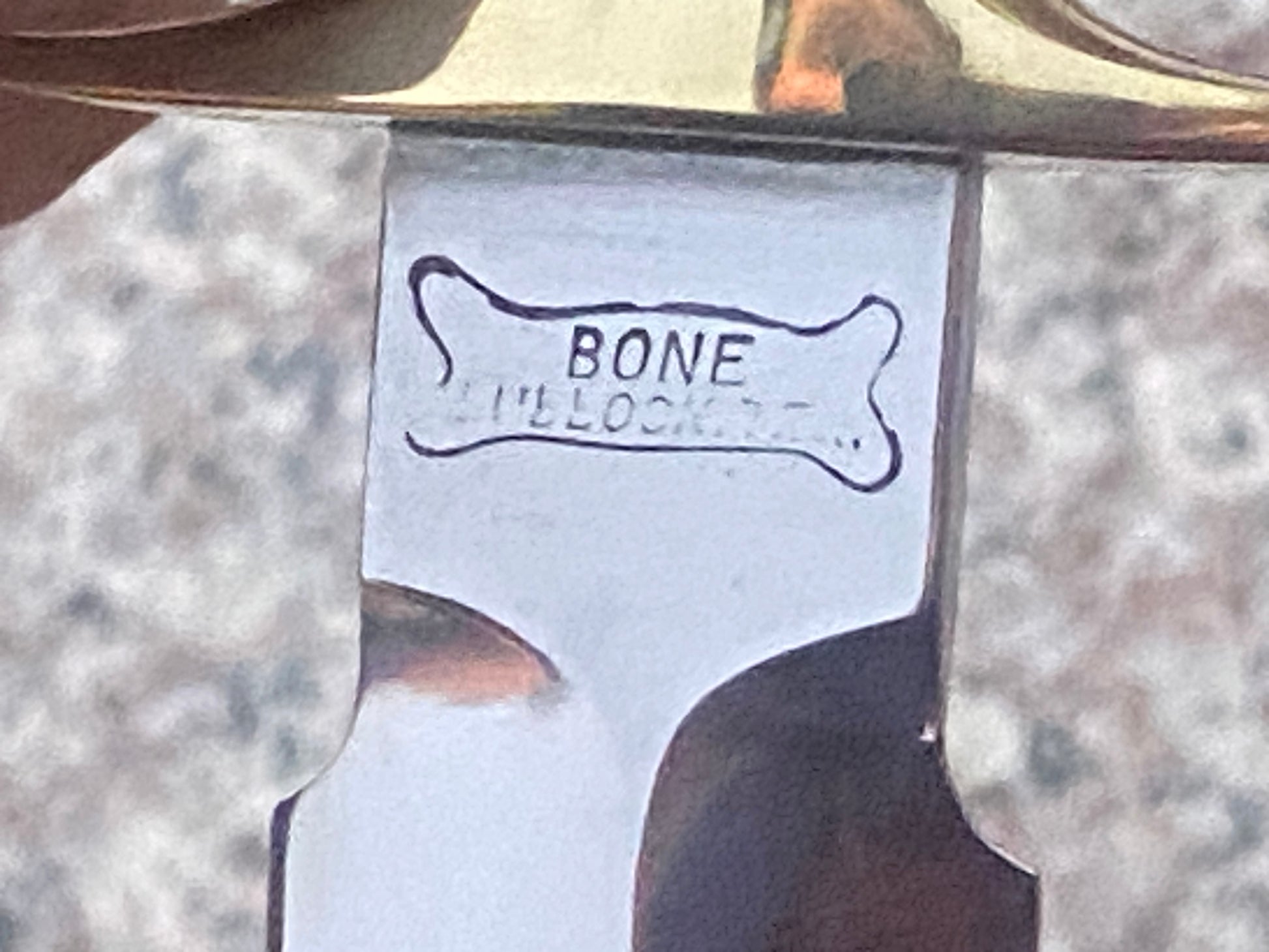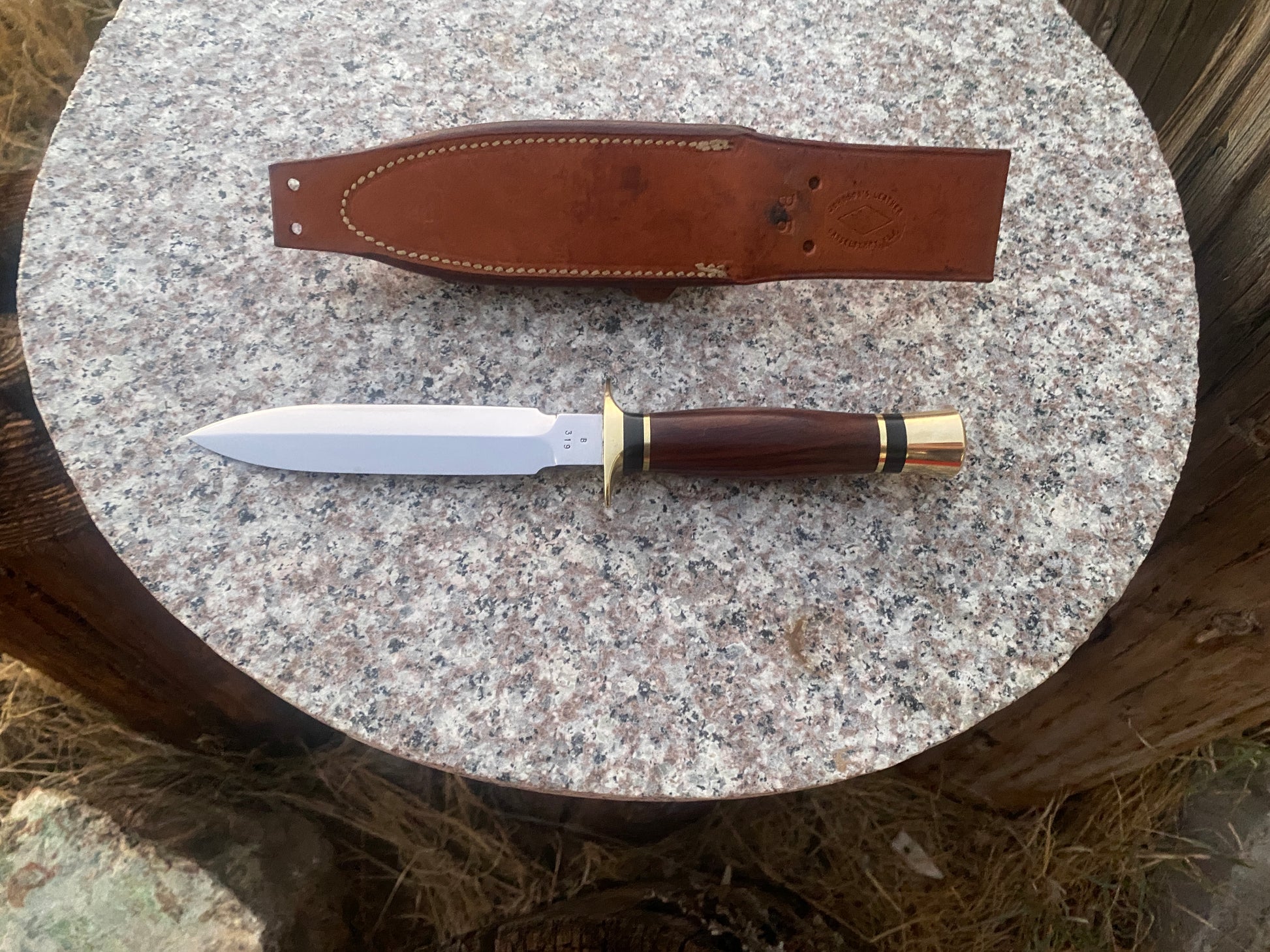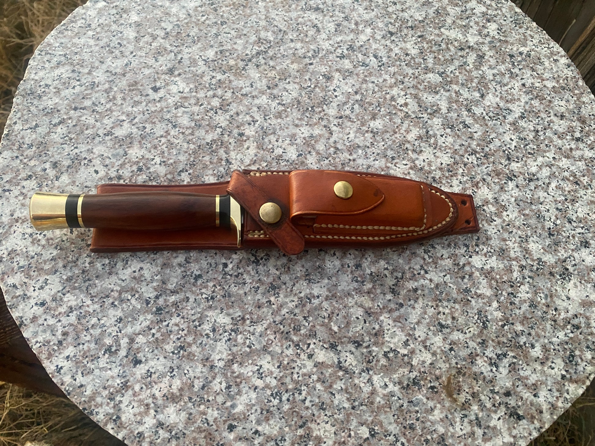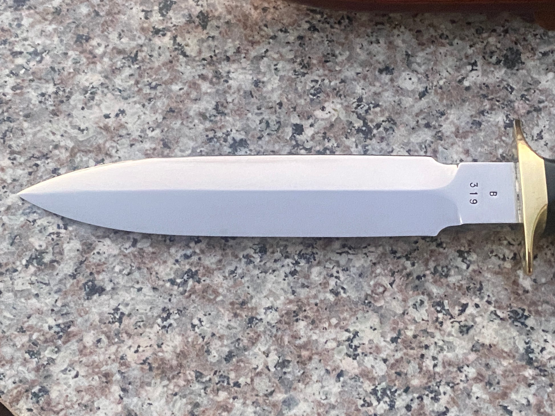 So what we have here is a beautiful Ralph Bone 319 Dagger Sheath Knife. This knife is in fantastic unused condition but I have it marked as used because I do not have the box or paper work witch I do not know if it even came with any paper work or a box. The sheath that comes with this knife is the original one and is also in pretty great condition however it does have some marks and stains on it from traveling to and from shows (see photos) . Please be sure to look at all the photos carefully as they are part of the description.