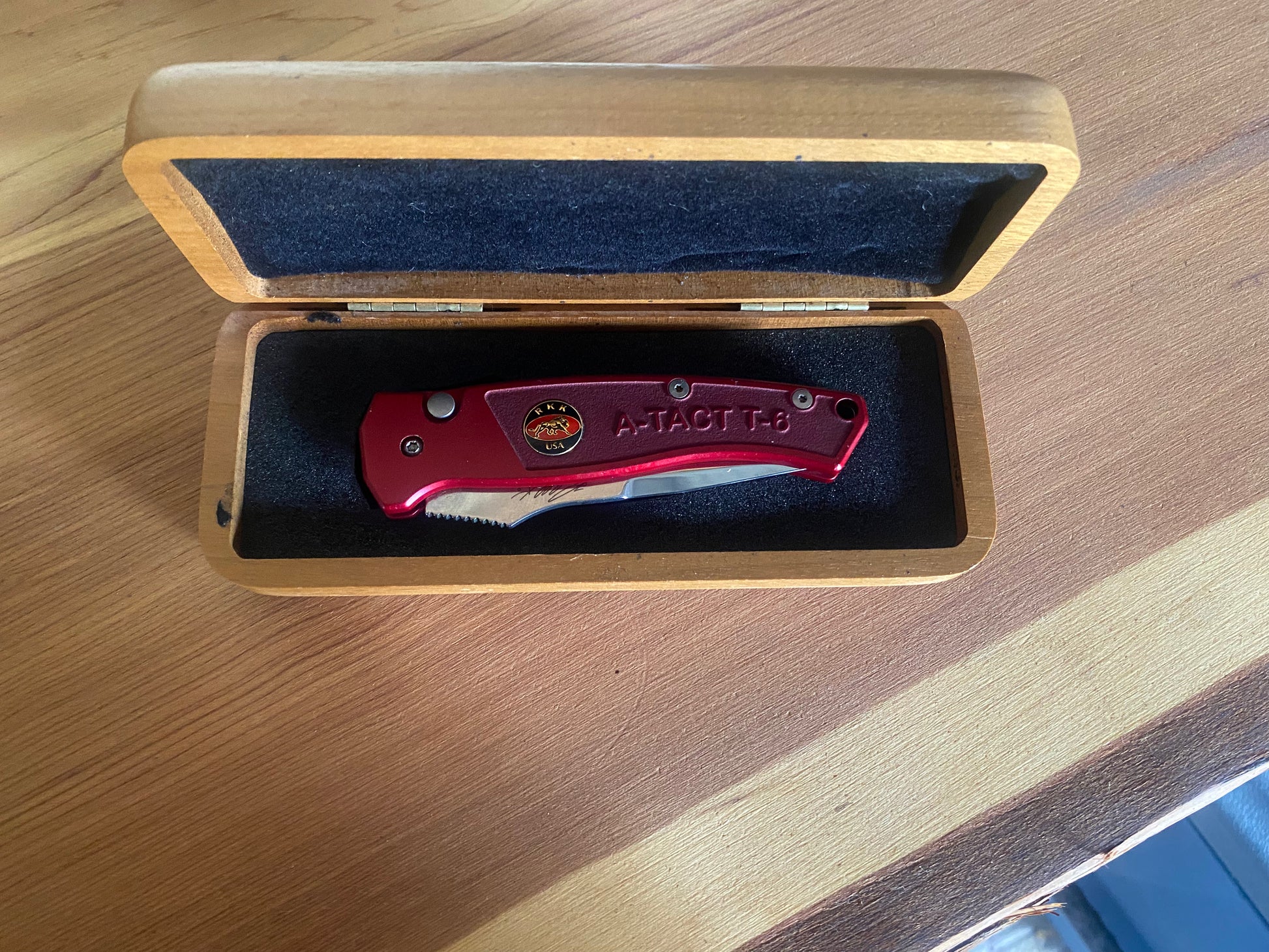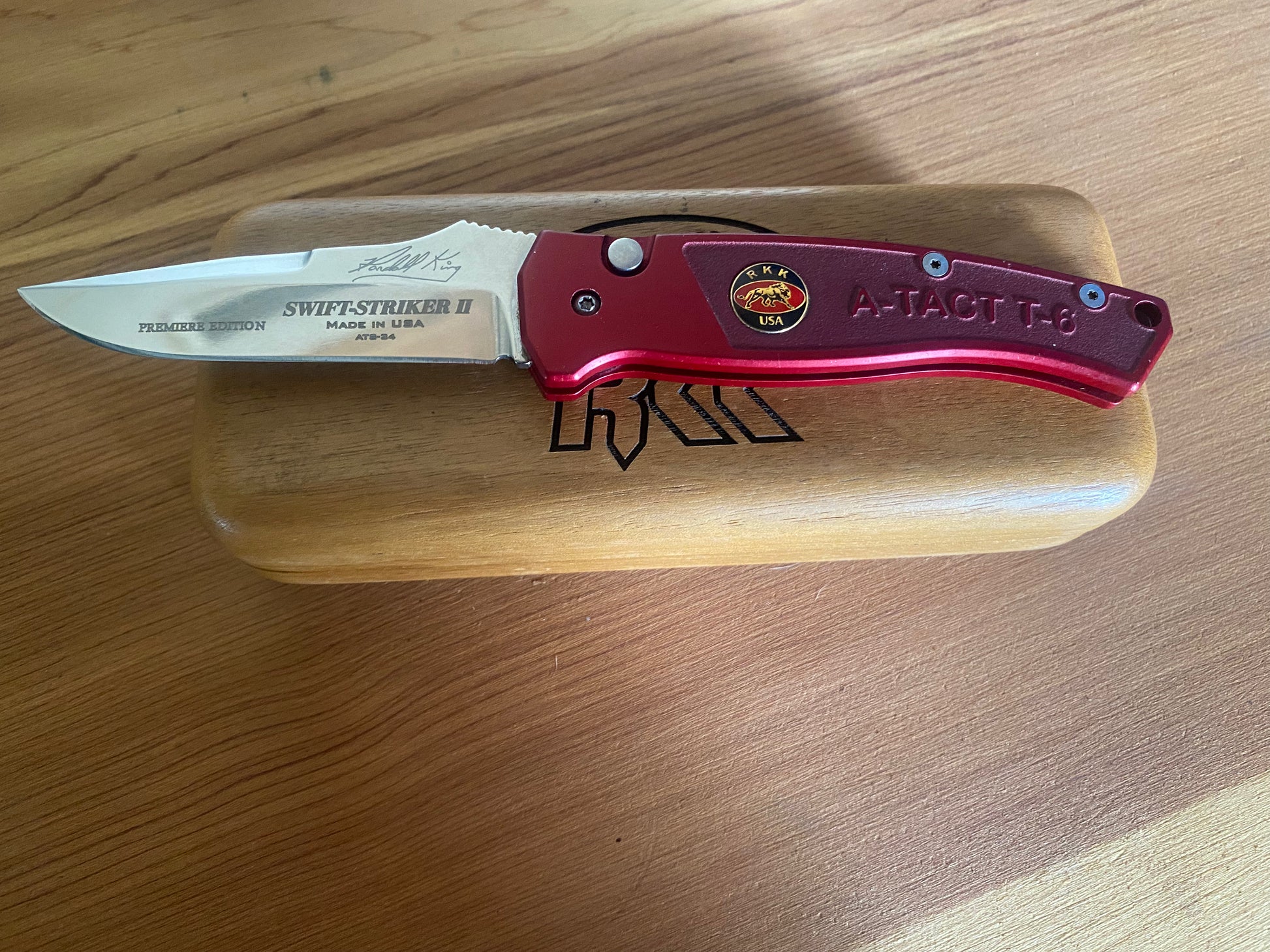 So what we have here is a beautiful Randall King Knives Premiere Edition Swift Striker II Automatic Pocket Knife. This knife is in great condition and appears to have not been used or sharpened, but it does have some small nicks on the back of the handles and is missing its pocket clip, likely caused by the previous owner as this is how I received it.The wood box is original and is also in great condition but its cover is in poor condition (see photos). Please be sure to look at all the photos carefully as they are part of the description.