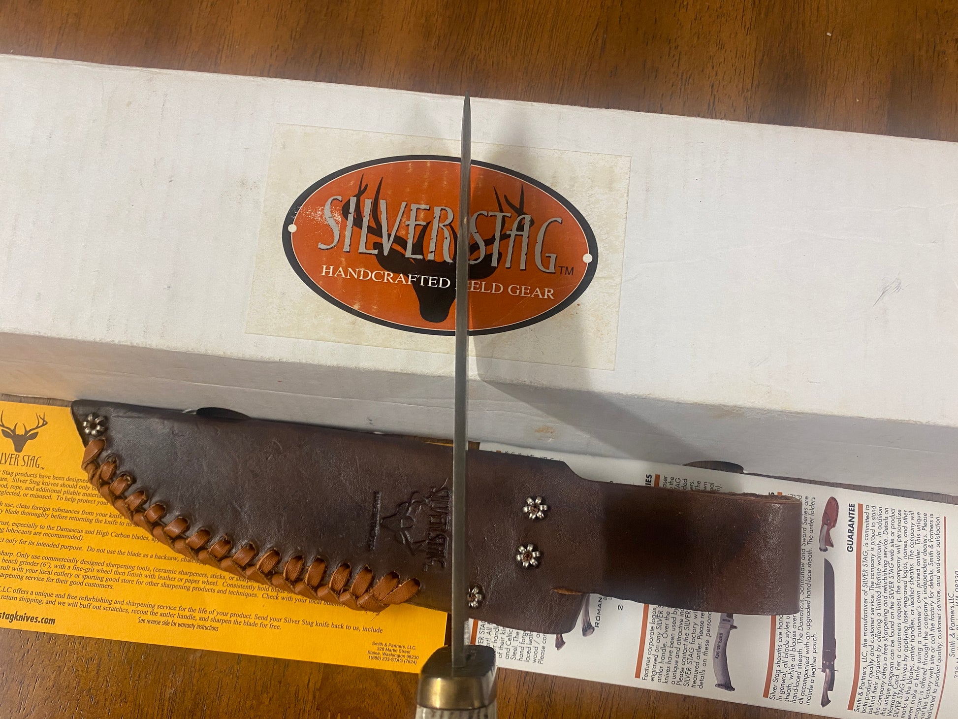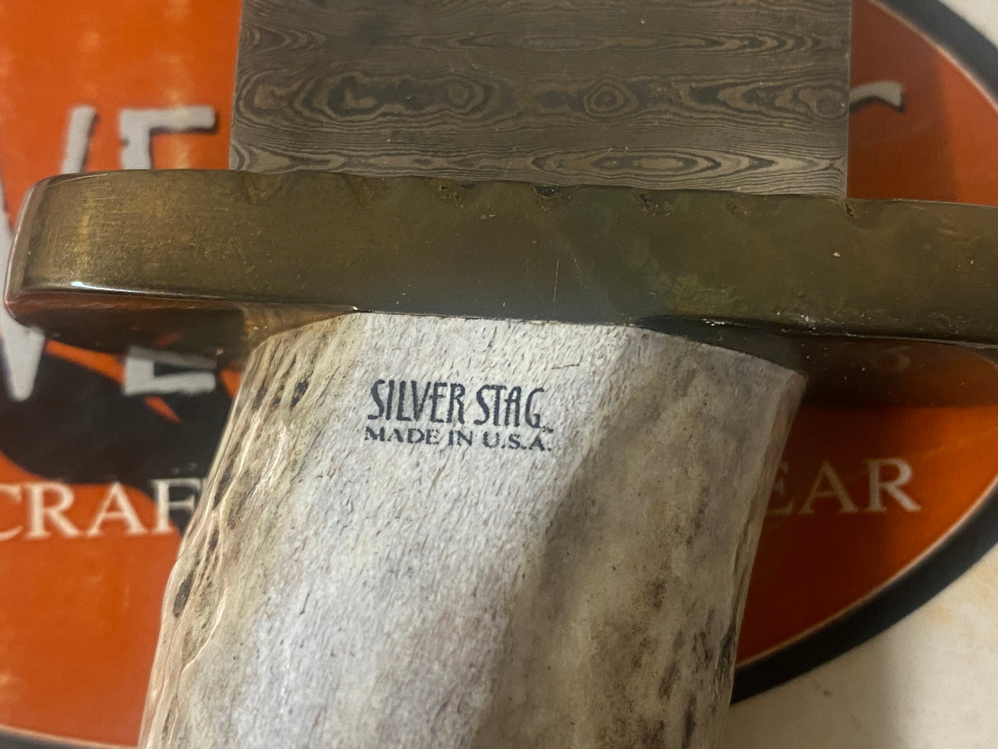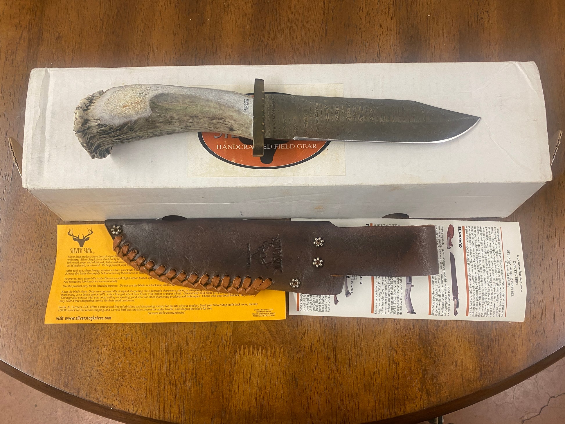 So what we have here is a beautiful Silver Stag DPB6.5 Damascus Bowie knife. This knife is in fantastic condition appears not to have been carried, used or sharpened. The sheath that comes with this knife is the original one and is also in fantastic condition. The box and paperwork are original to but the box does have wear on it from traveling to and from shows. Please be sure to look at all the photos carefully as they are part of the description.