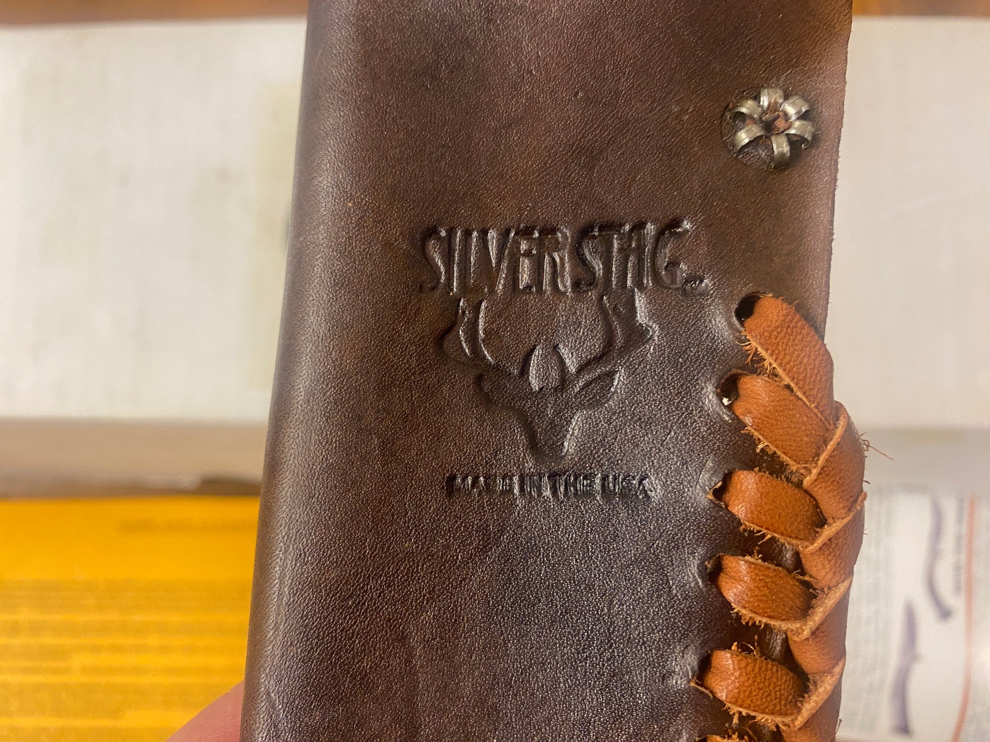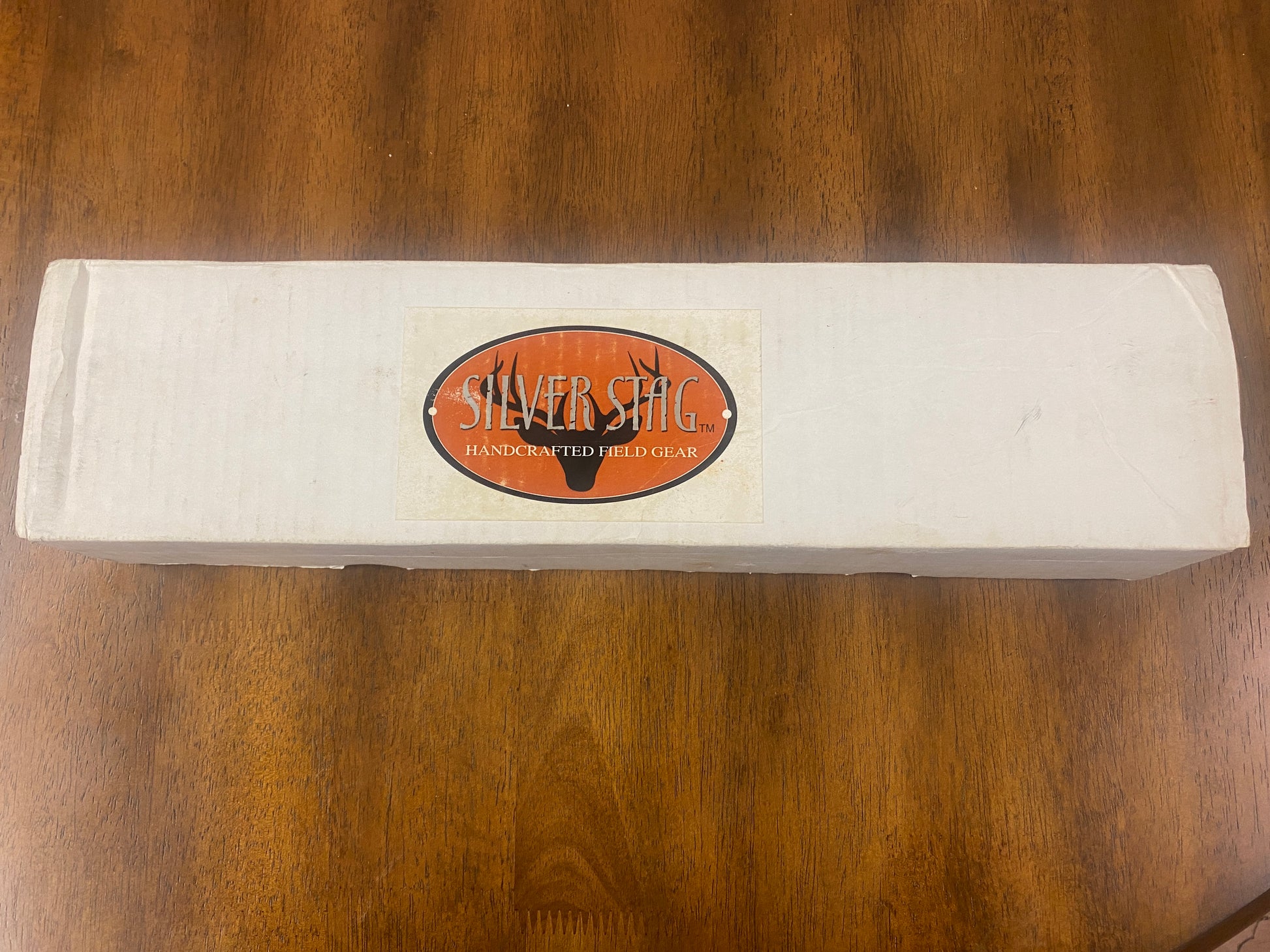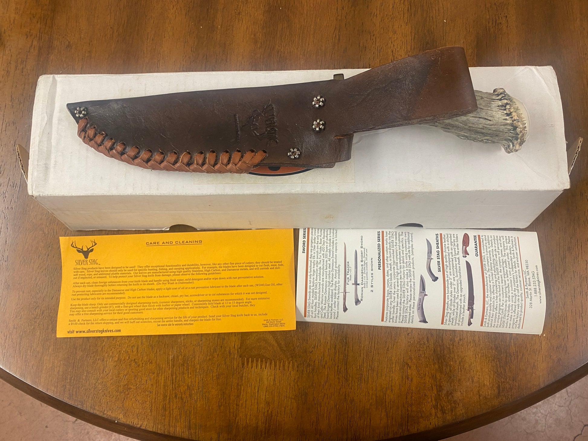 So what we have here is a beautiful Silver Stag DPB6.5 Damascus Bowie knife. This knife is in fantastic condition appears not to have been carried, used or sharpened. The sheath that comes with this knife is the original one and is also in fantastic condition. The box and paperwork are original to but the box does have wear on it from traveling to and from shows. Please be sure to look at all the photos carefully as they are part of the description.