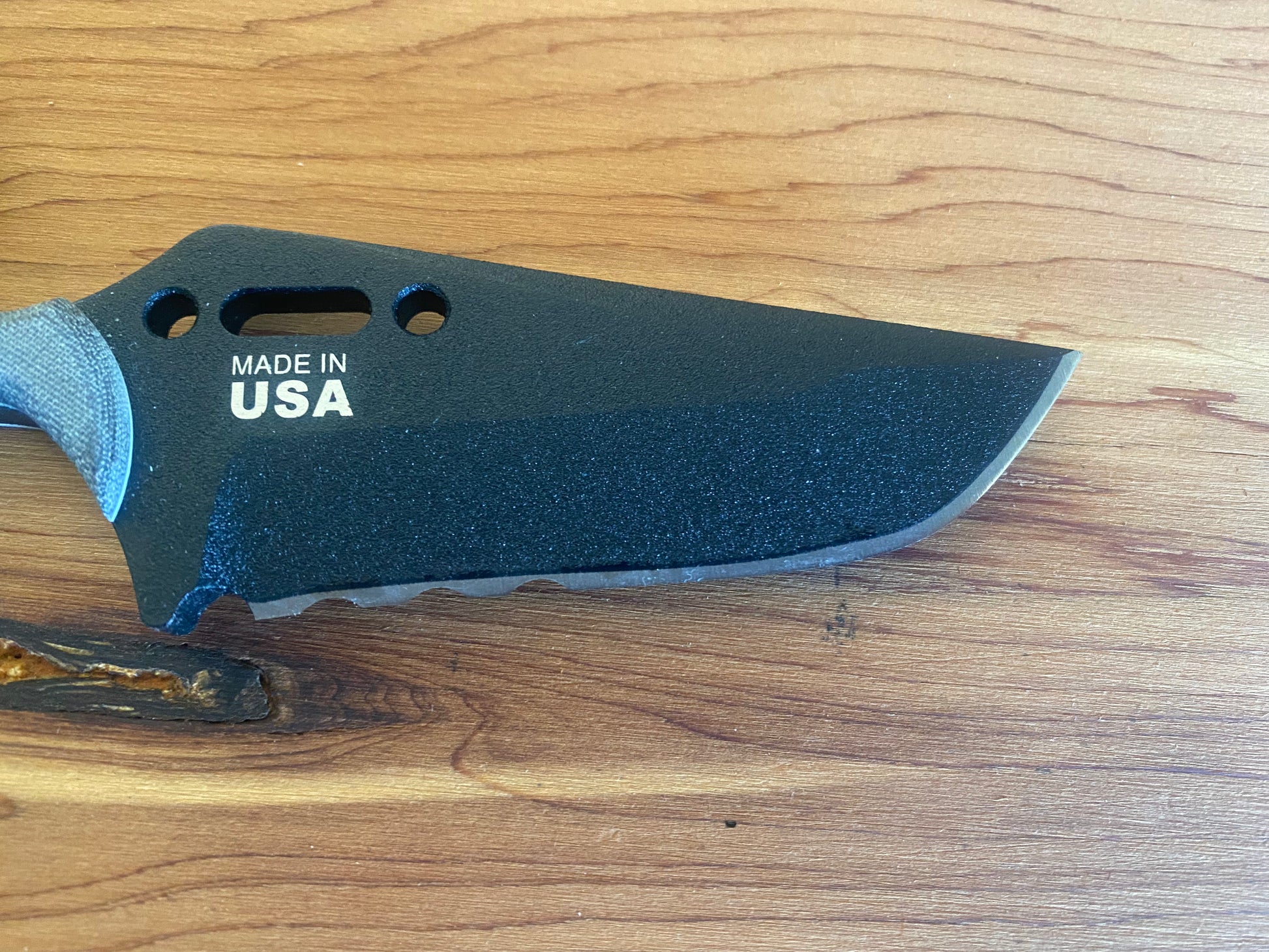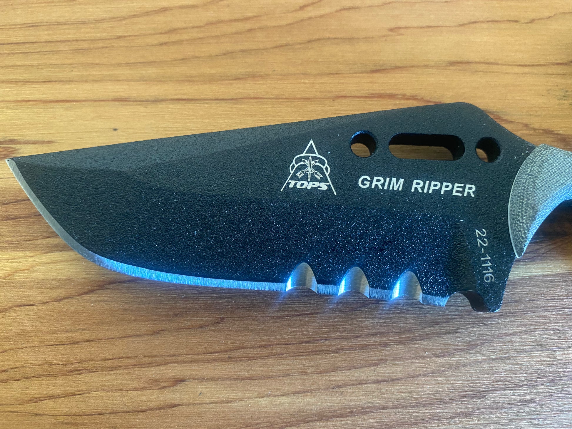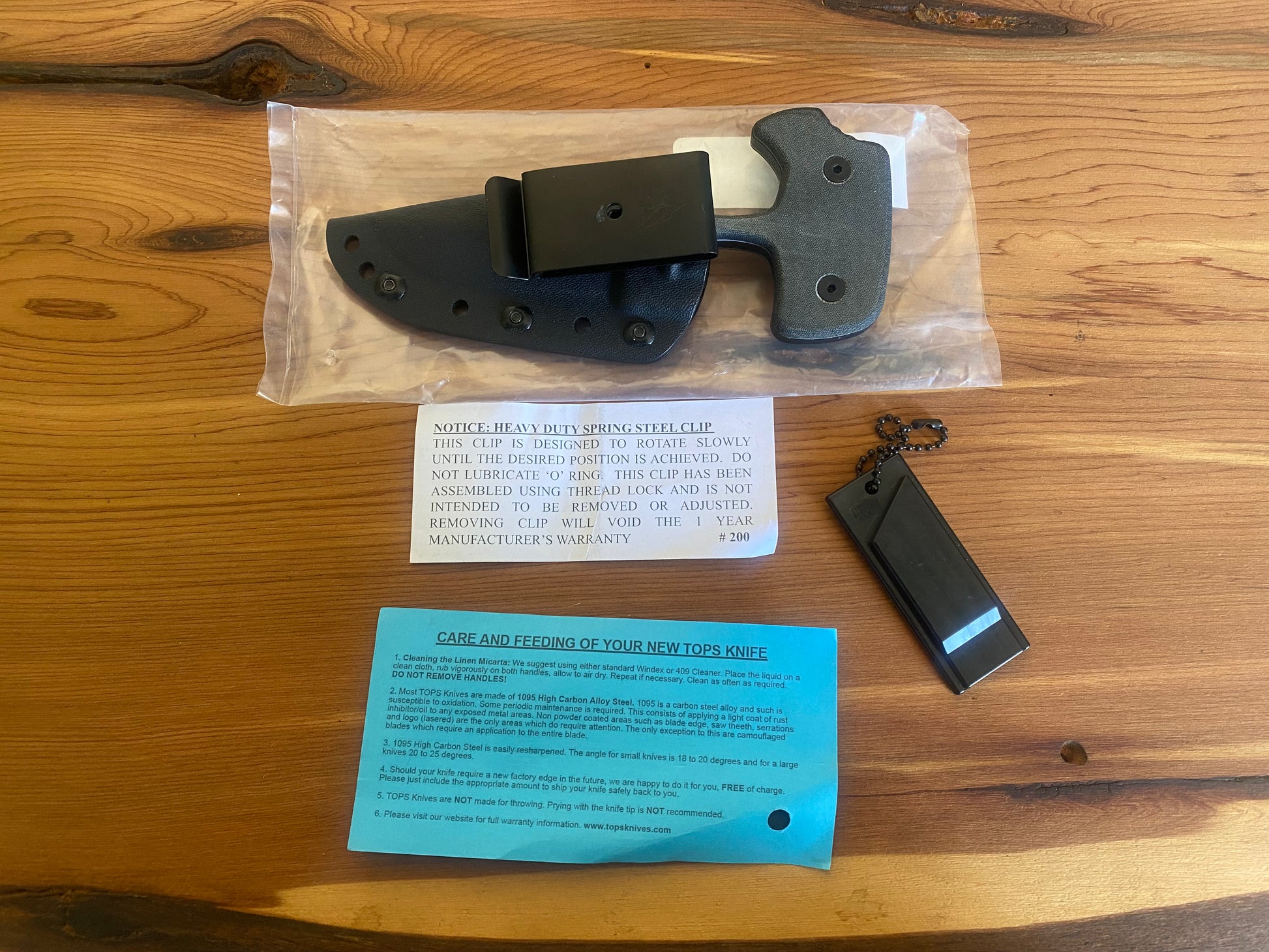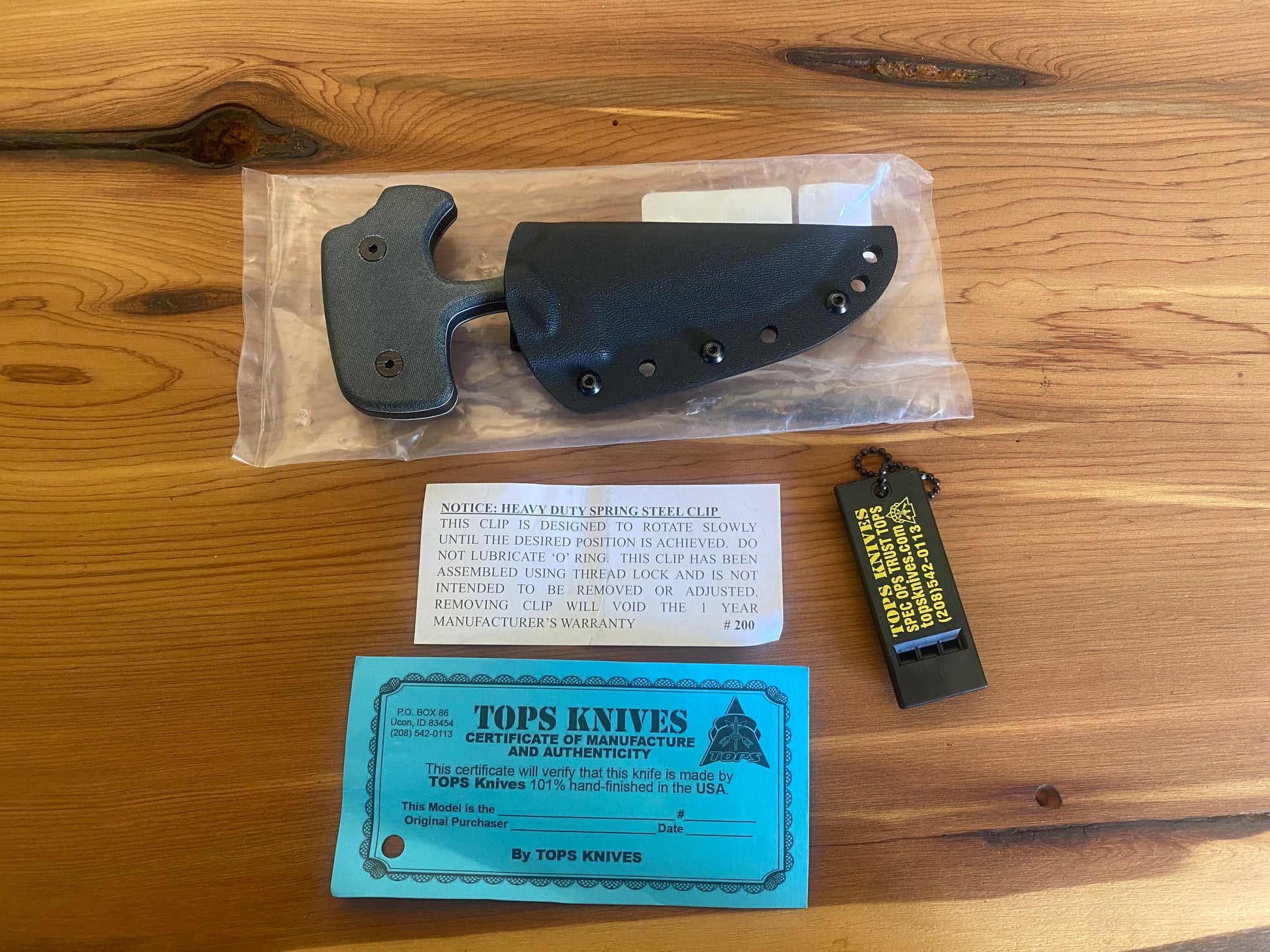 So what we have here is a beautiful Tops Grim Ripper Push Dagger. This knife is in fantastic unused condition. The sheath, bag, paper work, and whistle that comes with this blade is the original and is also in fantastic unused condition. Please be sure to look at all the photos carefully as they are part of the description.