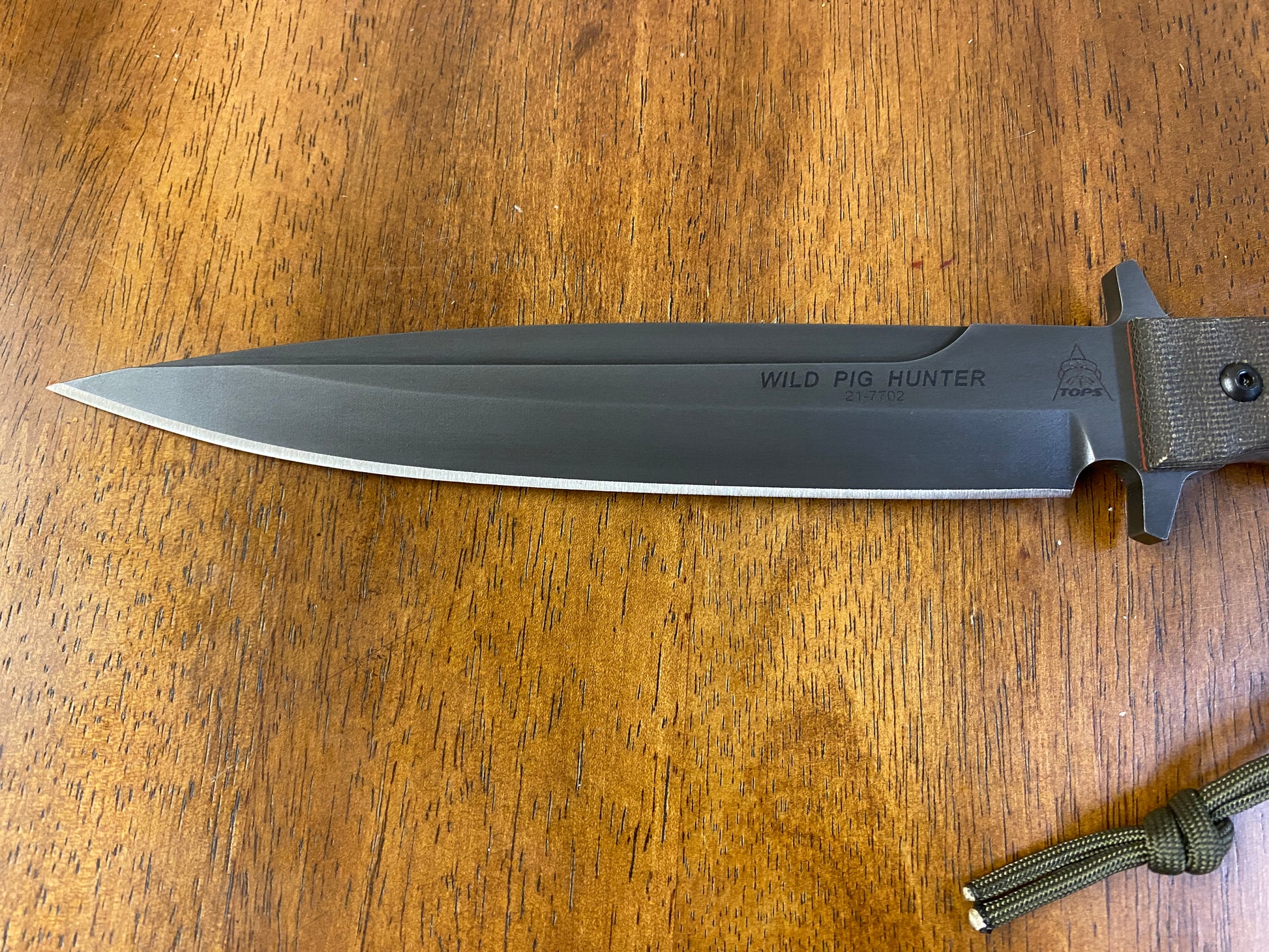 So what we have here is a beautiful Tops Wild Pig Hunter Sheath Knife. This knife is in fantastic condition and appears to have not been used, sharpened, or carried. The sheath that comes with this knife is the original one and is also in fantastic condition and comes with its whistle plastic bag and card. Please be sure to look at all the photos carefully as they are part of the description.