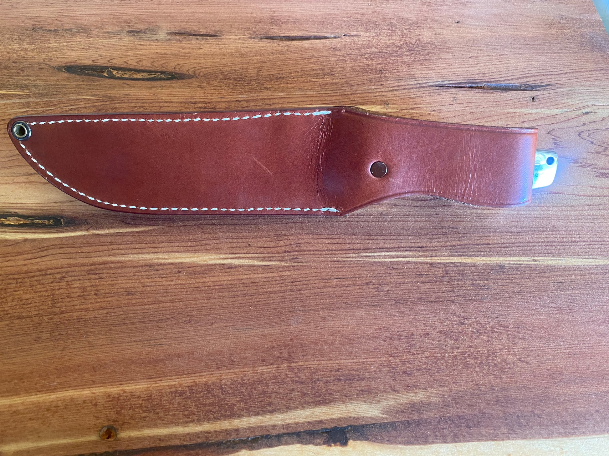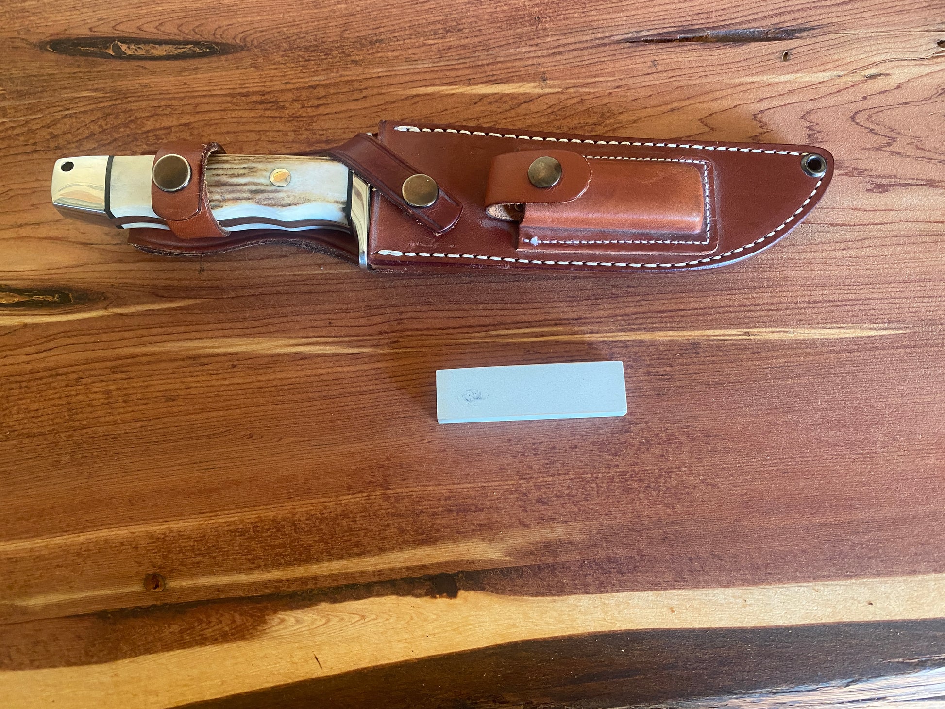So what we have here is a beautiful A.G. Russell 1998 Tak Fukuta Bowie Knife. This knife is in fantastic unused condition and comes with its original sheath and sharpening stone that is also in fantastic condition. Please be sure to look at all the photos carefully as they are part of the description.