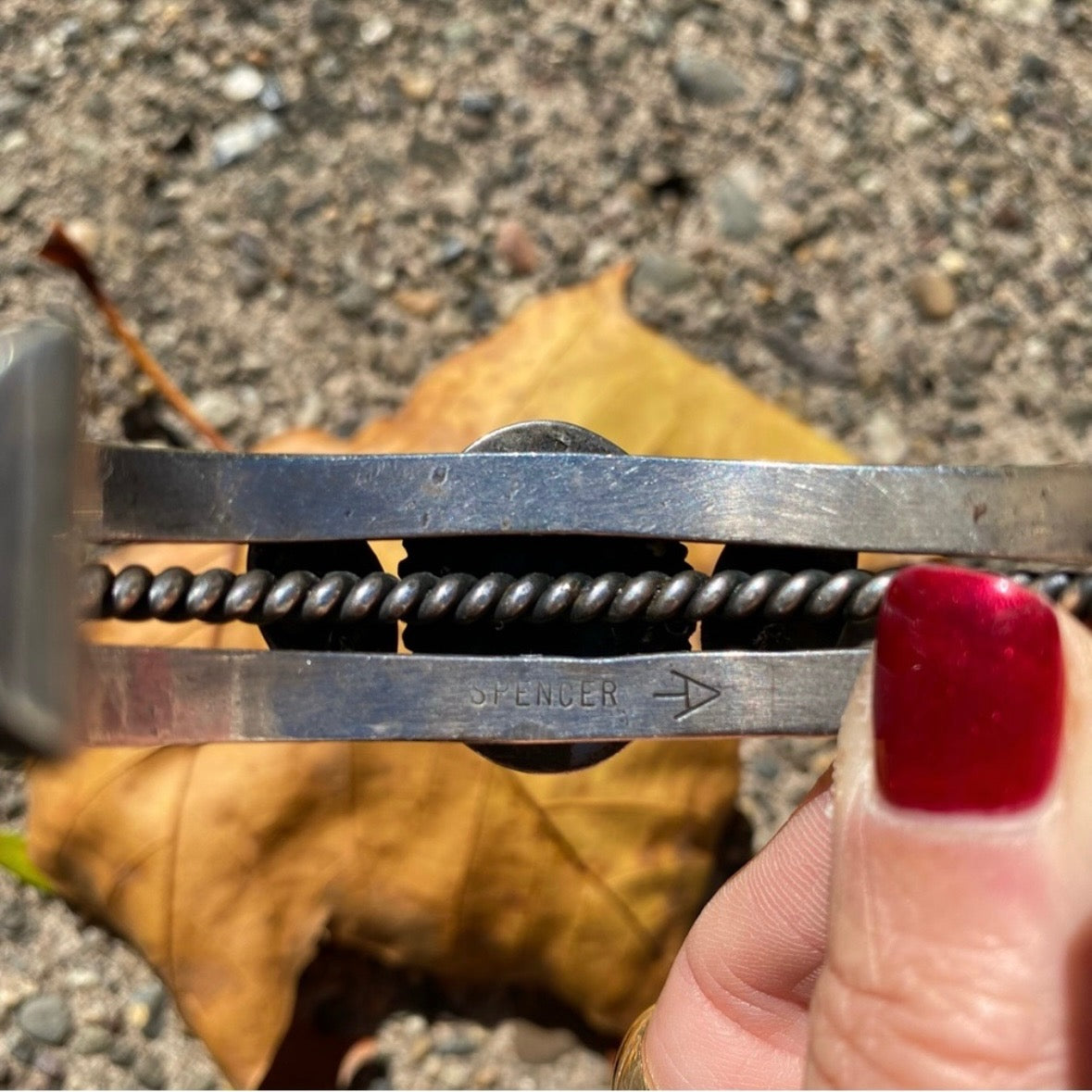 This vintage unisex heavy gauge silver & turquoise cuff bracelet would be a great addition to any jewelry collection! It weighs 73 grams and tapers from 1/2 inch to 1 inch in width. The inside measures 5-1/2 inches end to end plus a 1-1/2 inch gap for a total inner circumference of 7 inches. Stamped & signed by artist Spencer for Atkinson Trading Company.