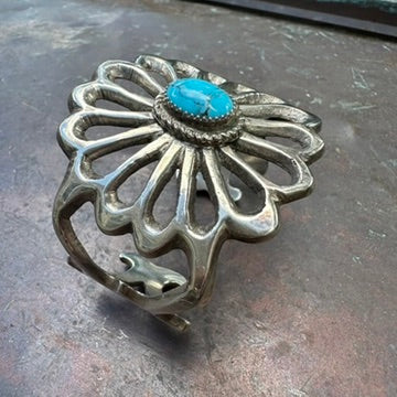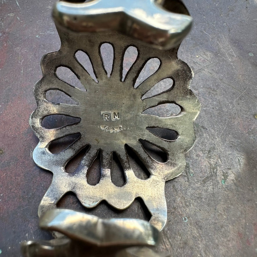 Vintage Cast Sterling Silver Turquoise Flower Cuff Bracelet, Signed RM