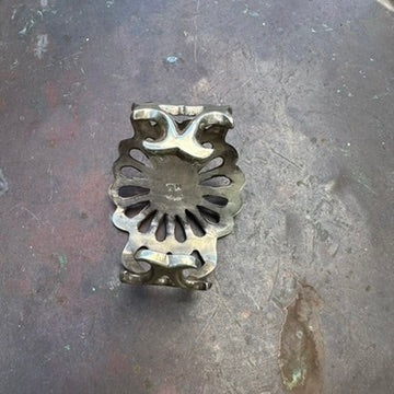 This vintage sterling tufa cast cuff bracelet has a beautiful radiating flower motif. It weighs 82 grams and tapers from 3/4 inch wide at the tips to 2 inches wide in the middle. The inside measures 5-1/4 inches end to end plus a 1-1/8 inch gap for a total inner circumference of approximately 6-1/4 inches. Definitely a staple for any vintage jewelry collection!