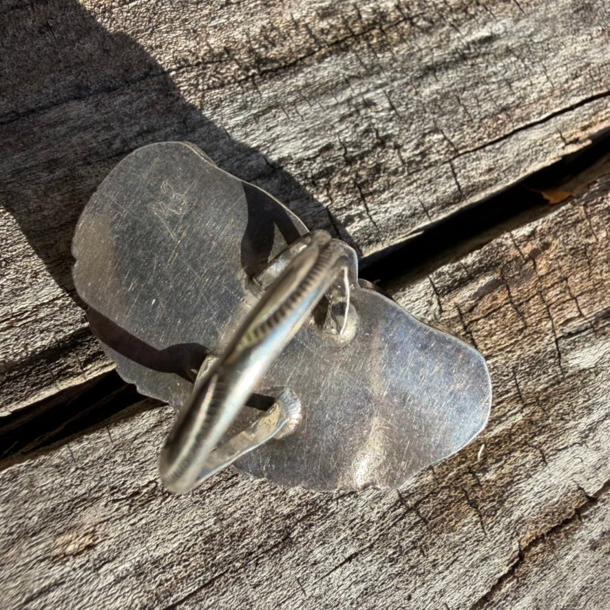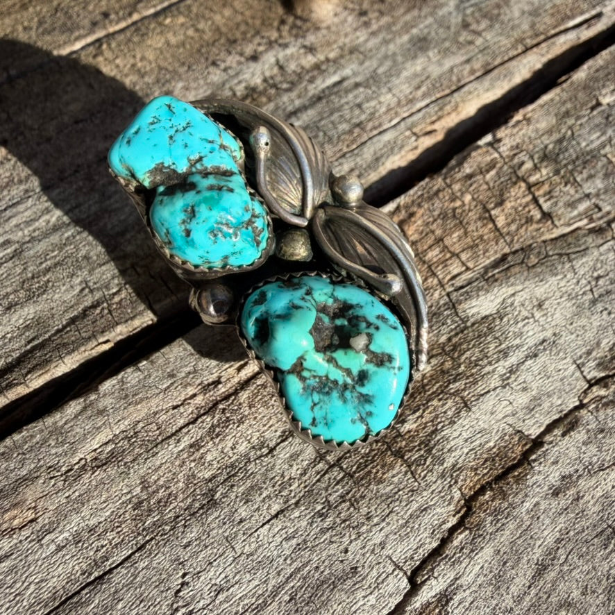 Stunning vintage double Kingman blue turquoise and sterling silver leaf motif ring signed by EW. This elegant ring is a timeless classic and features 2 older stones with natural matrix and pitting. The face of this ring measures 1-1/2 x 3/4in and the 2mm band is stamped with the eyelash motif.