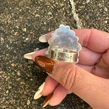 Beautiful vintage green Turquoise and Sterling Silver ring signed by Albert Cleveland. This ring features a beautiful scrolling design around the bezel and an organic shaped minty sage green turquoise. The face of this ring measures 1-3/4 x 1-1/4in.